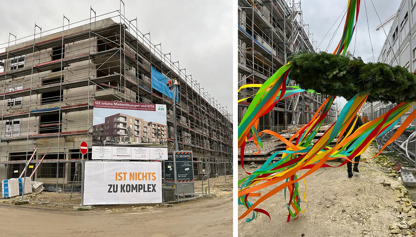 Auf Baufeld A10 im neuen Hannoverschen Stadtteil Kronsrode gab es am 23.11. das Richtfest zu feiern. Die GWH erstellt hier 122 Wohneinheiten und eine Kita.