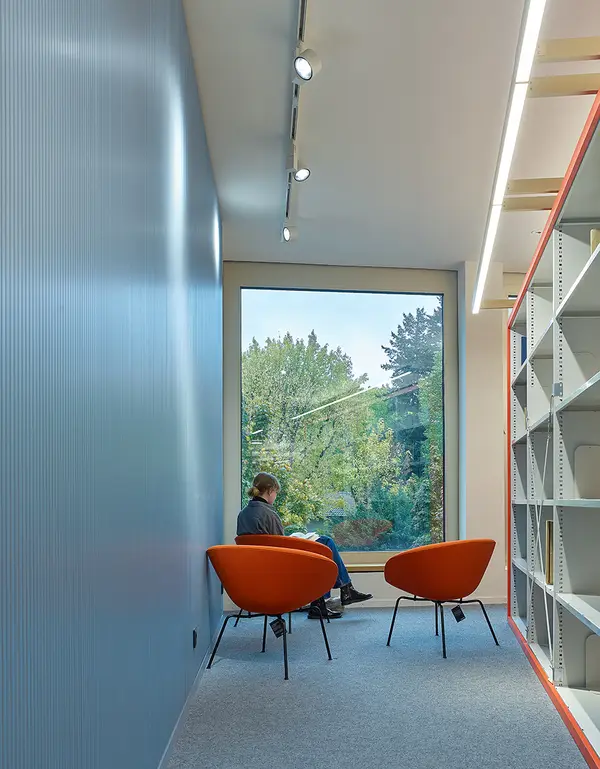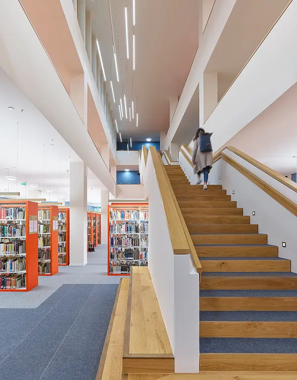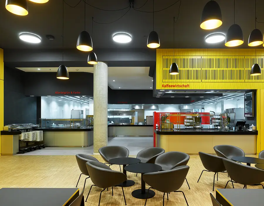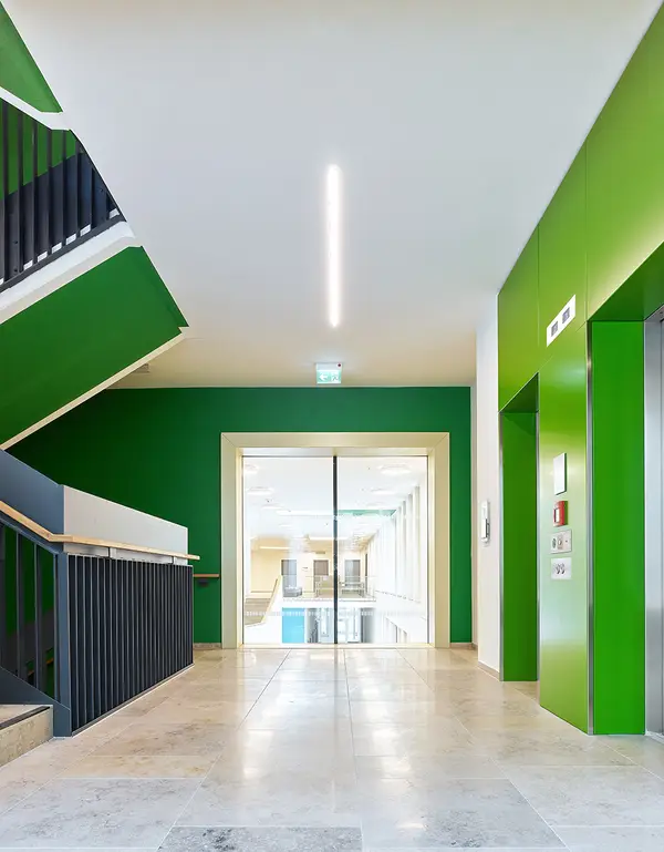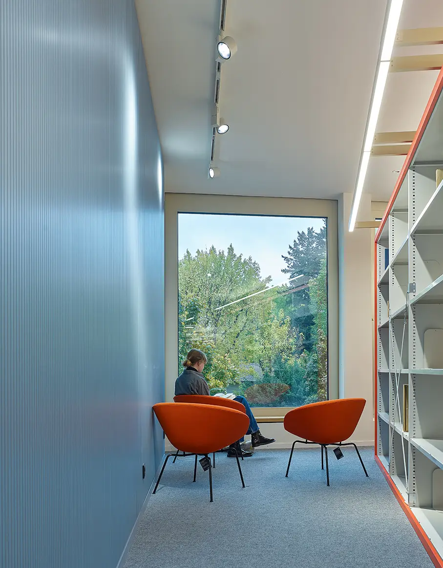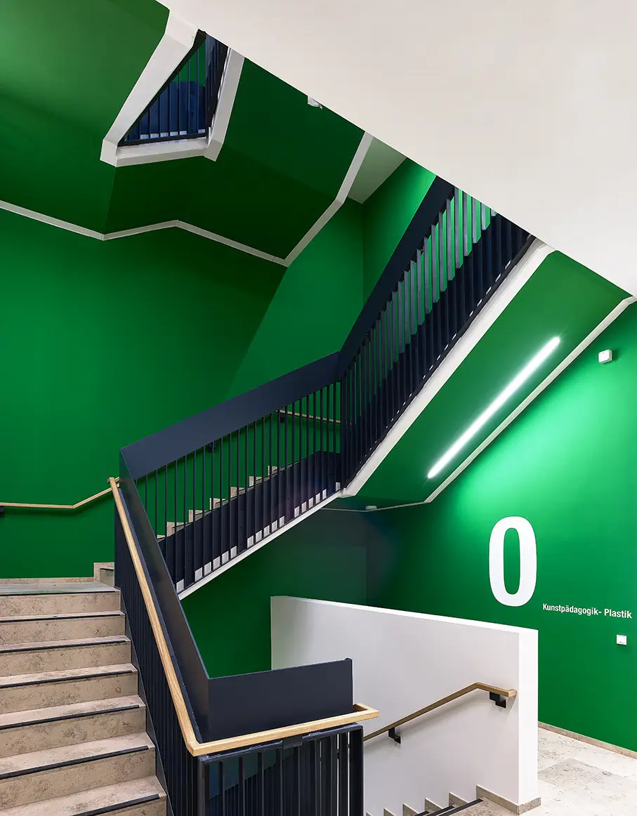 Vom Windfang des Haupteinganges betritt der Besucher das großzügig dimensionierte Foyer, von dem die verschiedenen Funktionsbereiche, der Hörsaal für 700 Personen sowie die Bibliothek erschlossen werden. Im Süden besteht die Möglichkeit der Anlieferung via eines kleinen Hofes für Mensa und ebenerdige Werkstätten.