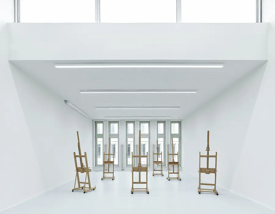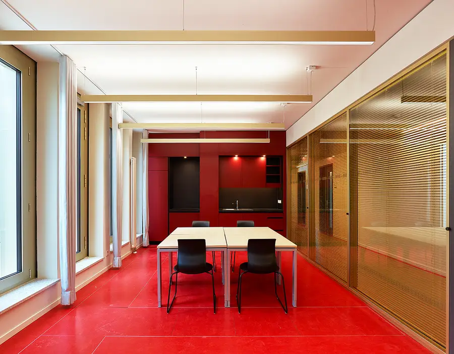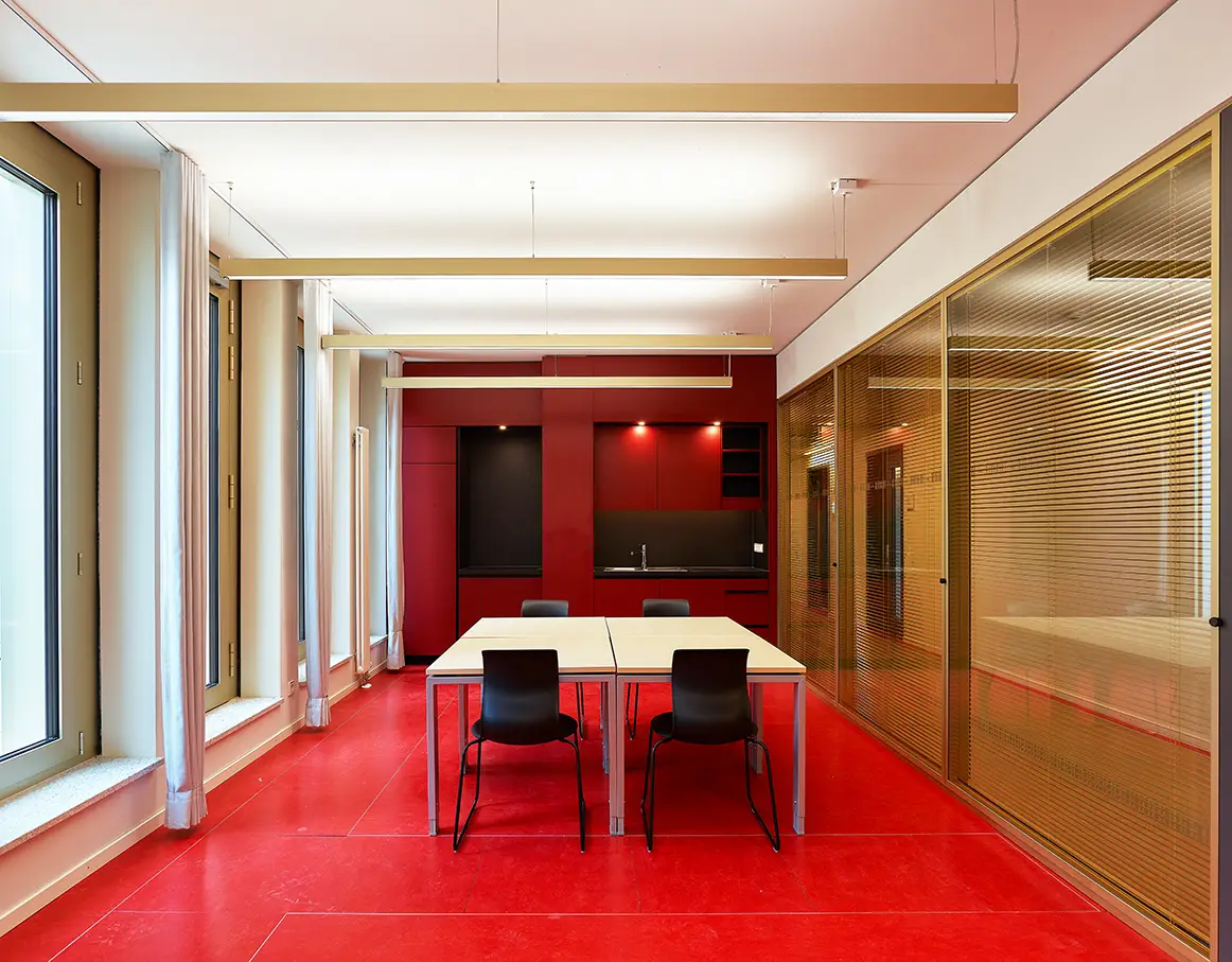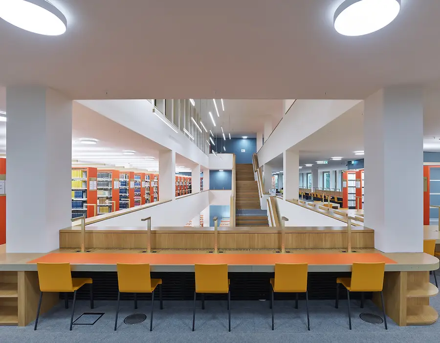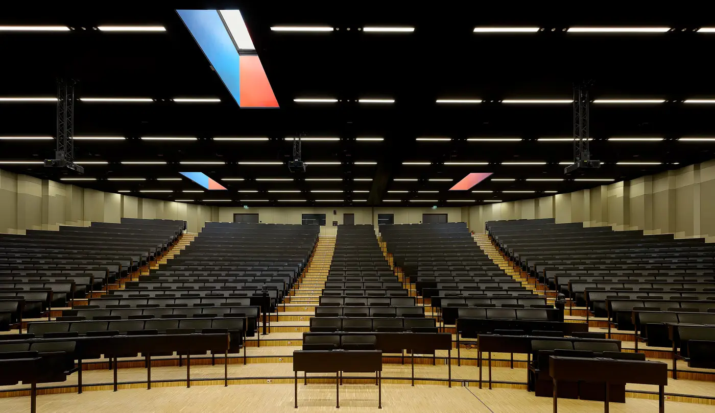 Vom Windfang des Haupteinganges betritt der Besucher das großzügig dimensionierte Foyer, von dem die verschiedenen Funktionsbereiche, der Hörsaal für 700 Personen sowie die Bibliothek erschlossen werden. Im Süden besteht die Möglichkeit der Anlieferung via eines kleinen Hofes für Mensa und ebenerdige Werkstätten.