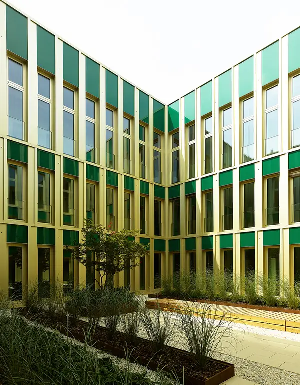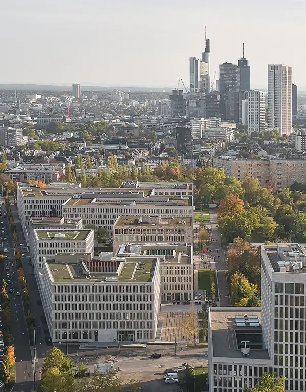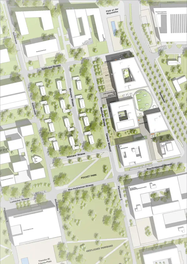 Der Entwurf entwickelt ein städtebauliches Ensemble aus 4 kubischen in Höhe und Breite verschiedenen Baukörpern, die unterschiedliche Nutzungen aufnehmen und diese ablesbar werden lassen. Für den Neubau wird die Materialität des Poelzig Baus IG Farben und das Fassadenprinzip der in unterschiedliche Ebenen strukturierten Lochfassade in seiner Typologie variiert.