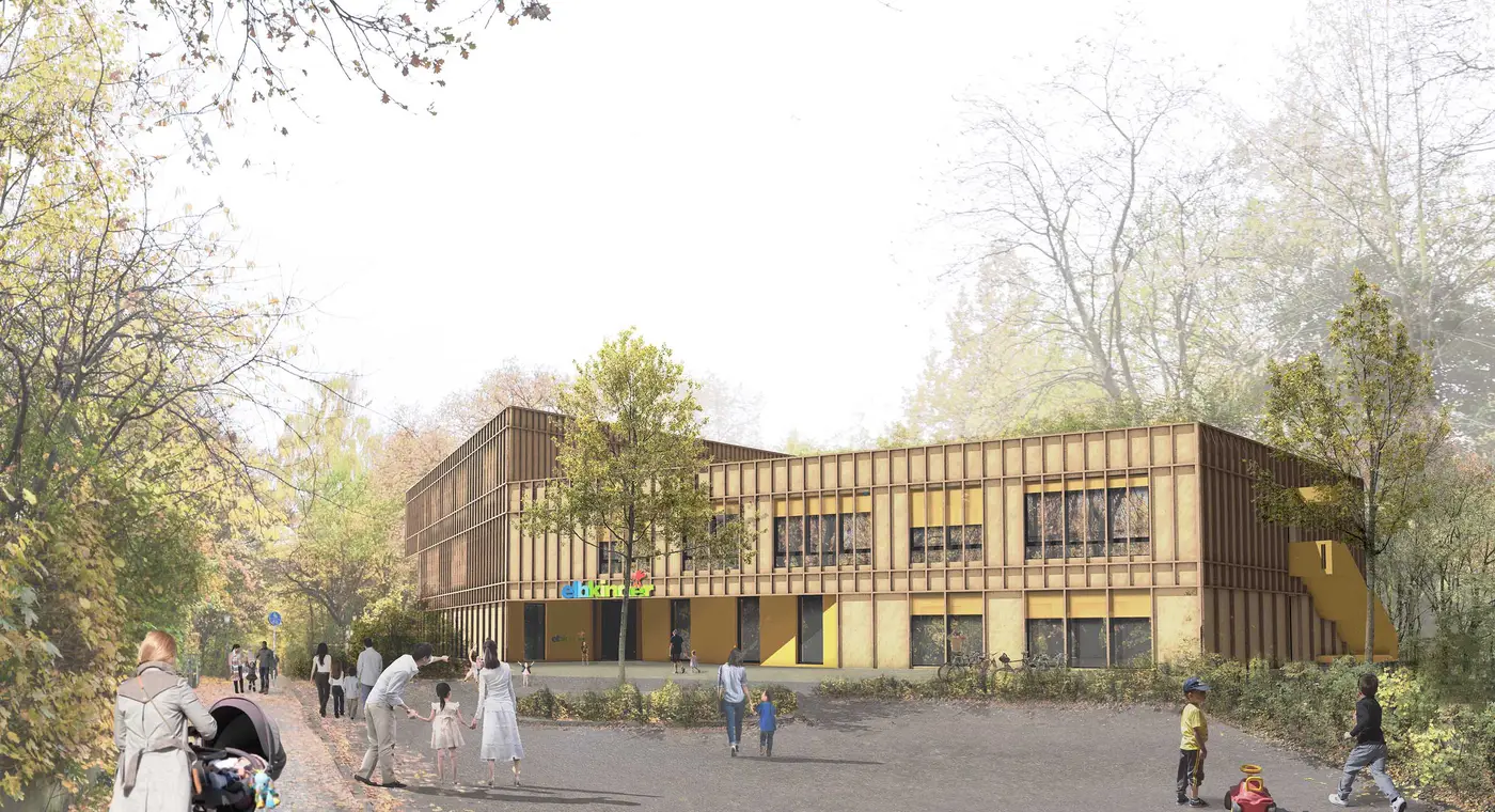 Die Kita schließt mit einer Fuge an die zukünftige Wohnbebauung entlang des Weges Bei der Paul-Gerhardt-Kirche an, staffelt sich dabei von einem 3 geschossigen Baukörper auf einen 2 Geschossigen Baukörper ab. Die polygonale Baukörperform der Kita ermöglicht es, auf städtebaulich gegebene Bedingungen zu reagieren: