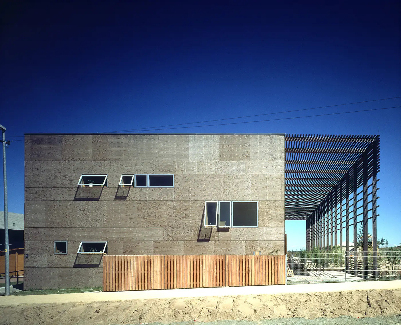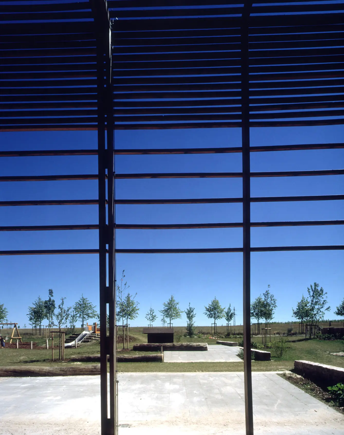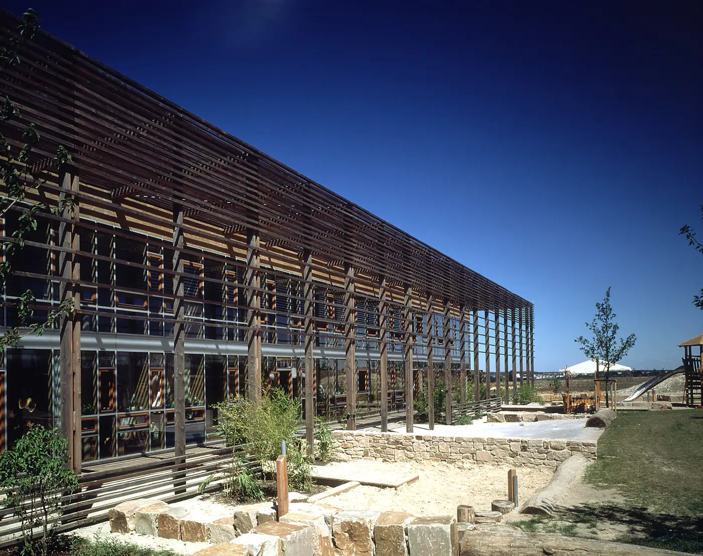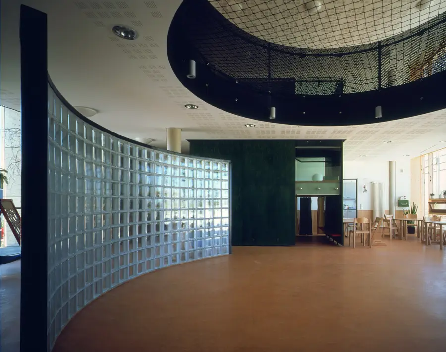 Im Rahmen der Weltausstellung EXPO 2000 entstand ein neuer Stadtteil in Hannover: Kronsberg. Am südlichen Rand dieses Stadtteils und am Übergang von Bebauung zur Landschaft war eine Kindertagesstätte für fünf Gruppen zu planen. Ausgangspunkt waren die sterbende, ländliche Charakteristik des Ortes und die geplante Umgebung in Form dreigeschossiger Wohnblöcke. Mit der einfachen, kubischen Form, einer im Süden vorgestellten zweigeschossigen Laube und dem Material Holz versucht der Entwurf die ländliche Geschichte des Ortes zu reflektieren und zum Teil der sinnlichen Wahrnehmung für die Kinder zu werden.