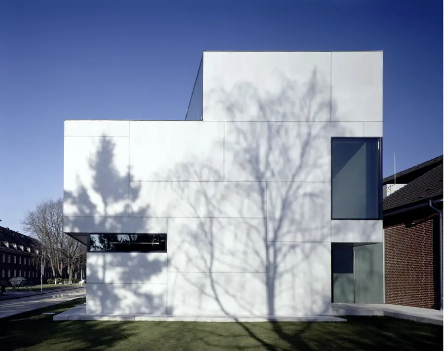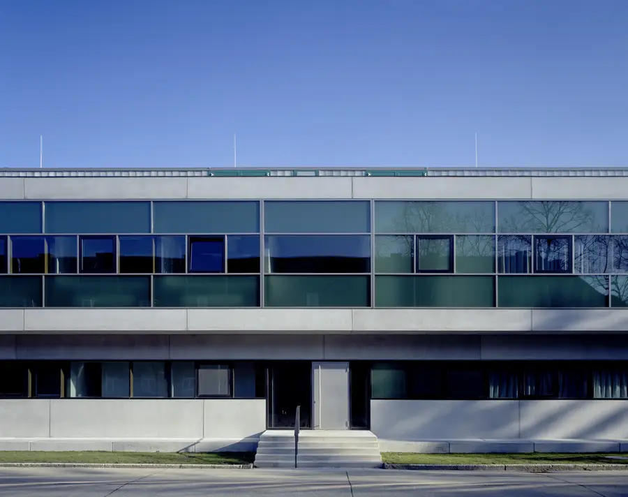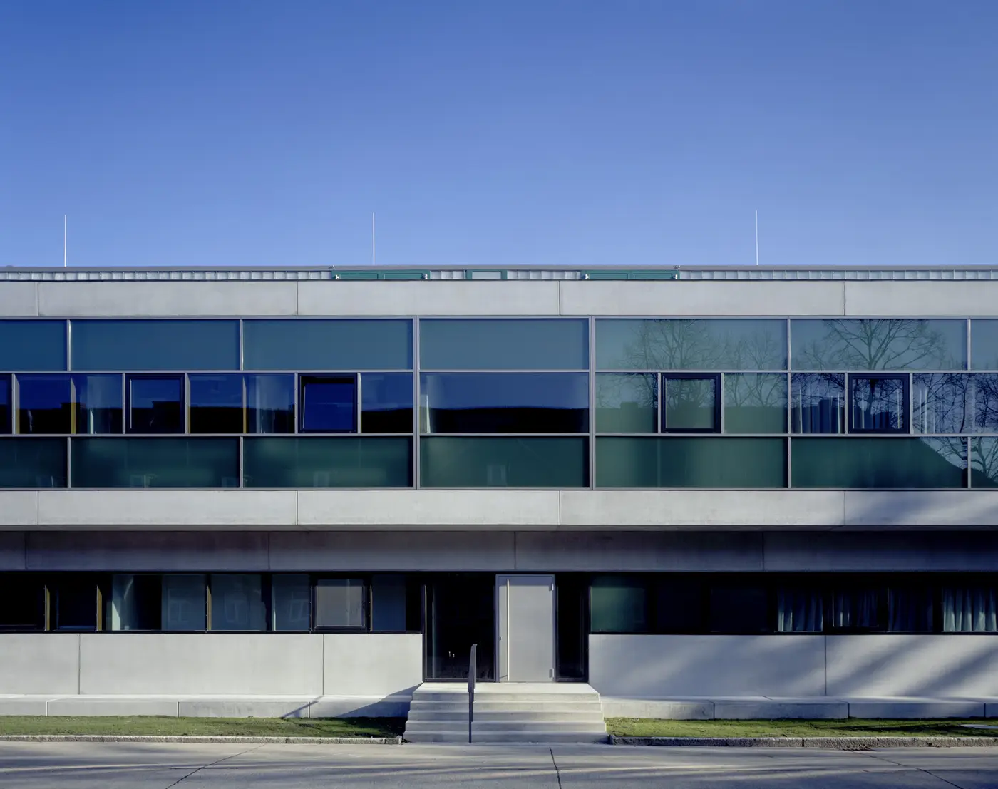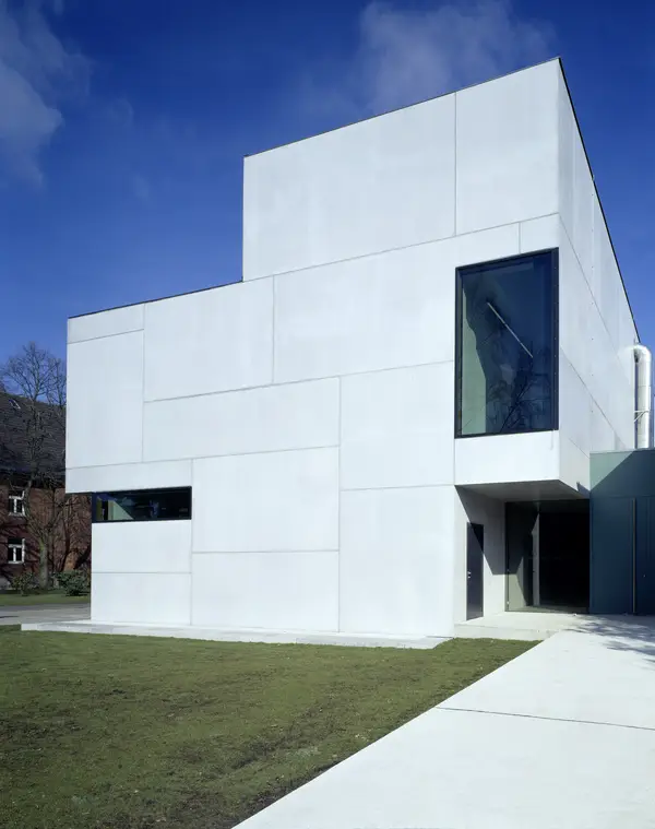 Die signifikante Schnittfigur des Neubaues mit dem auskragenden Obergeschoss und dem zurückgesetzten Technikgeschoss definiert einen neuen Straßenraum und eine neue architektonische Position im Verhältnis zur alten Campusbebauung, die durch die horizontale Gliederung der Fassade und den Sichtbeton unterstützt wird.