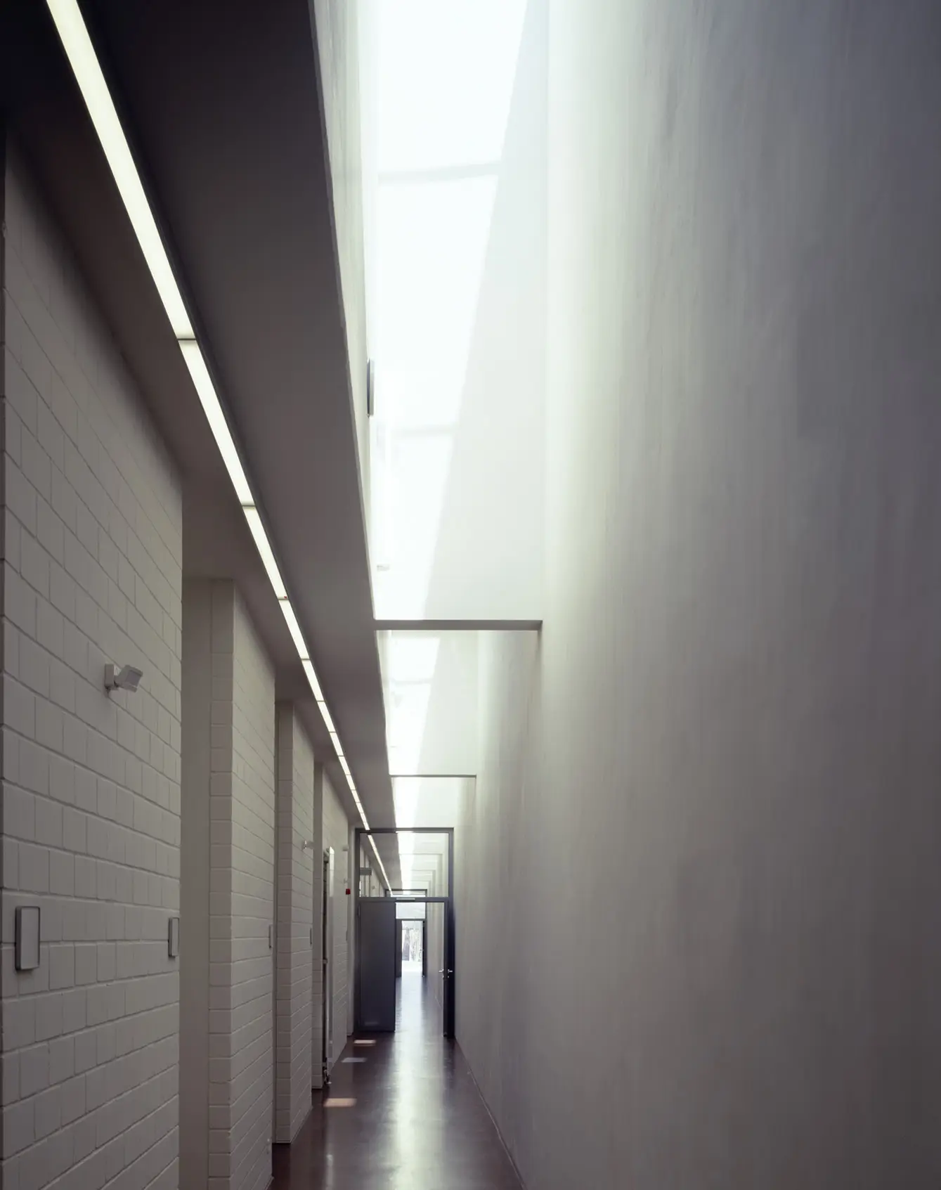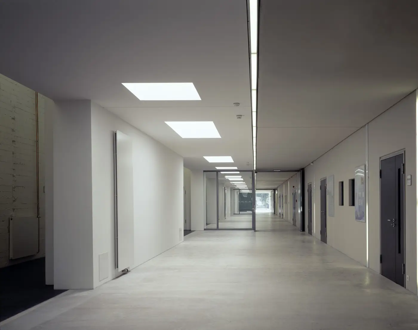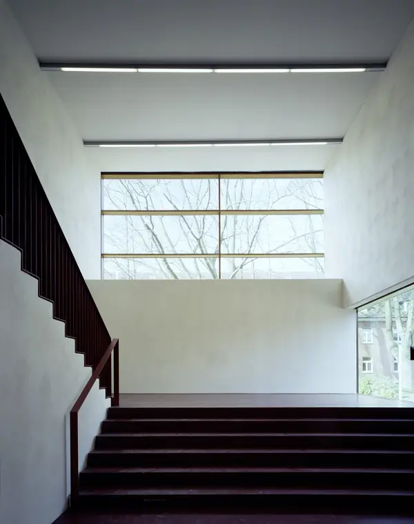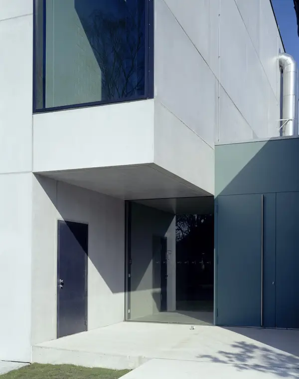 Die signifikante Schnittfigur des Neubaues mit dem auskragenden Obergeschoss und dem zurückgesetzten Technikgeschoss definiert einen neuen Straßenraum und eine neue architektonische Position im Verhältnis zur alten Campusbebauung, die durch die horizontale Gliederung der Fassade und den Sichtbeton unterstützt wird.