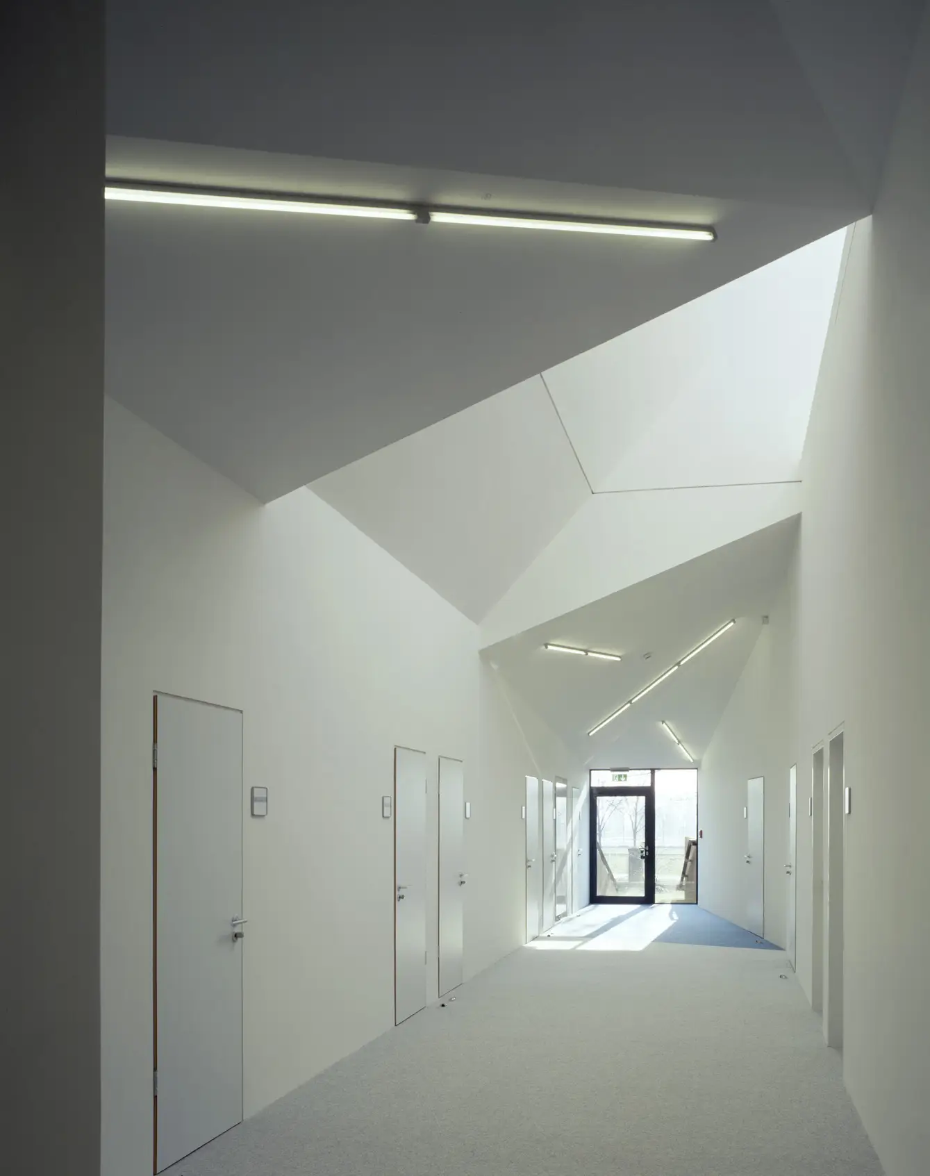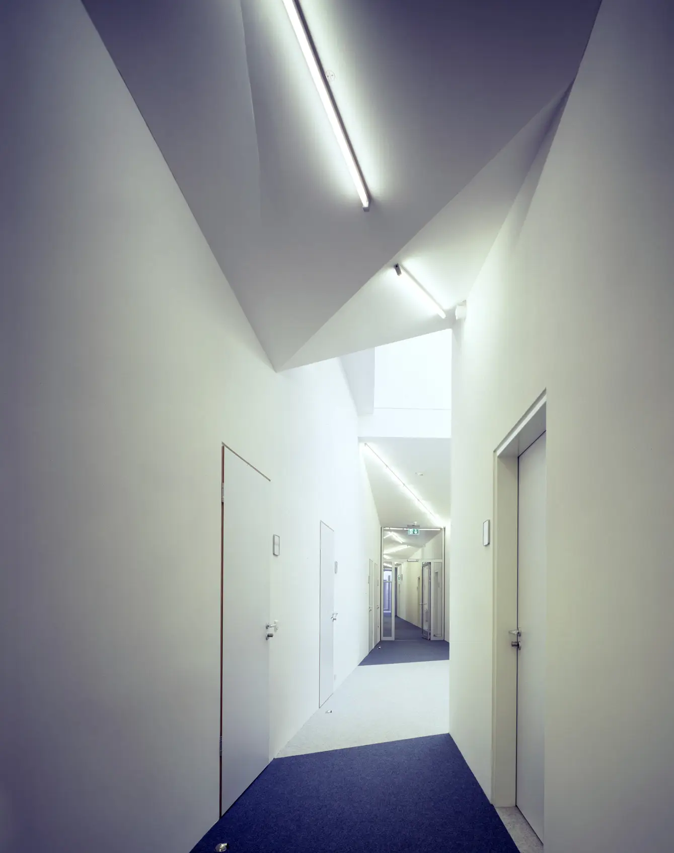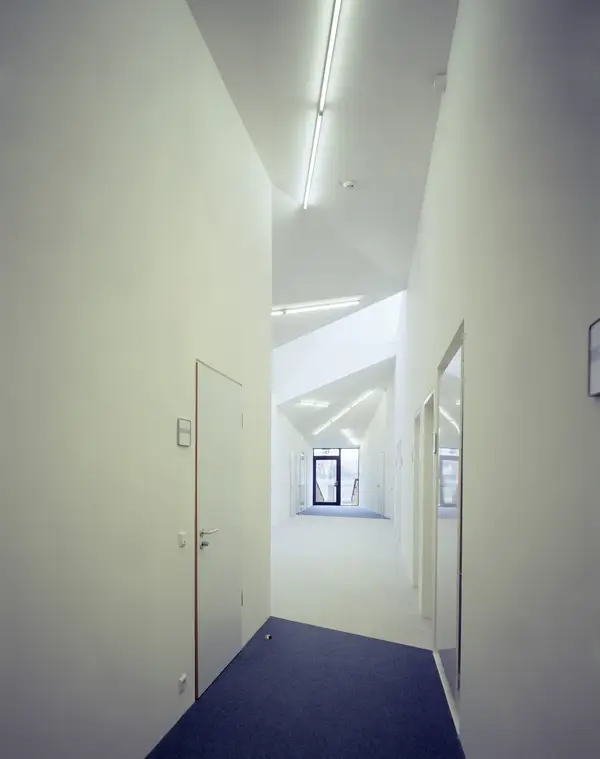 Aus Gründen der kurzfristigen Verfügbarkeit und wegen der positiven architektonischen und finanziellen Erfahrungen aus den anderen Altbauten wurde jedoch auch hier ein Umbau für ein zeitlich begrenztes “Provisorium" mit zwei ergänzenden Eingangsbereichen für die beiden Nutzungsbereiche erstellt.