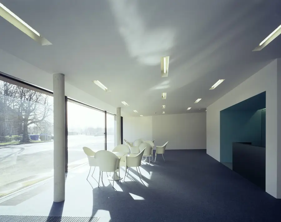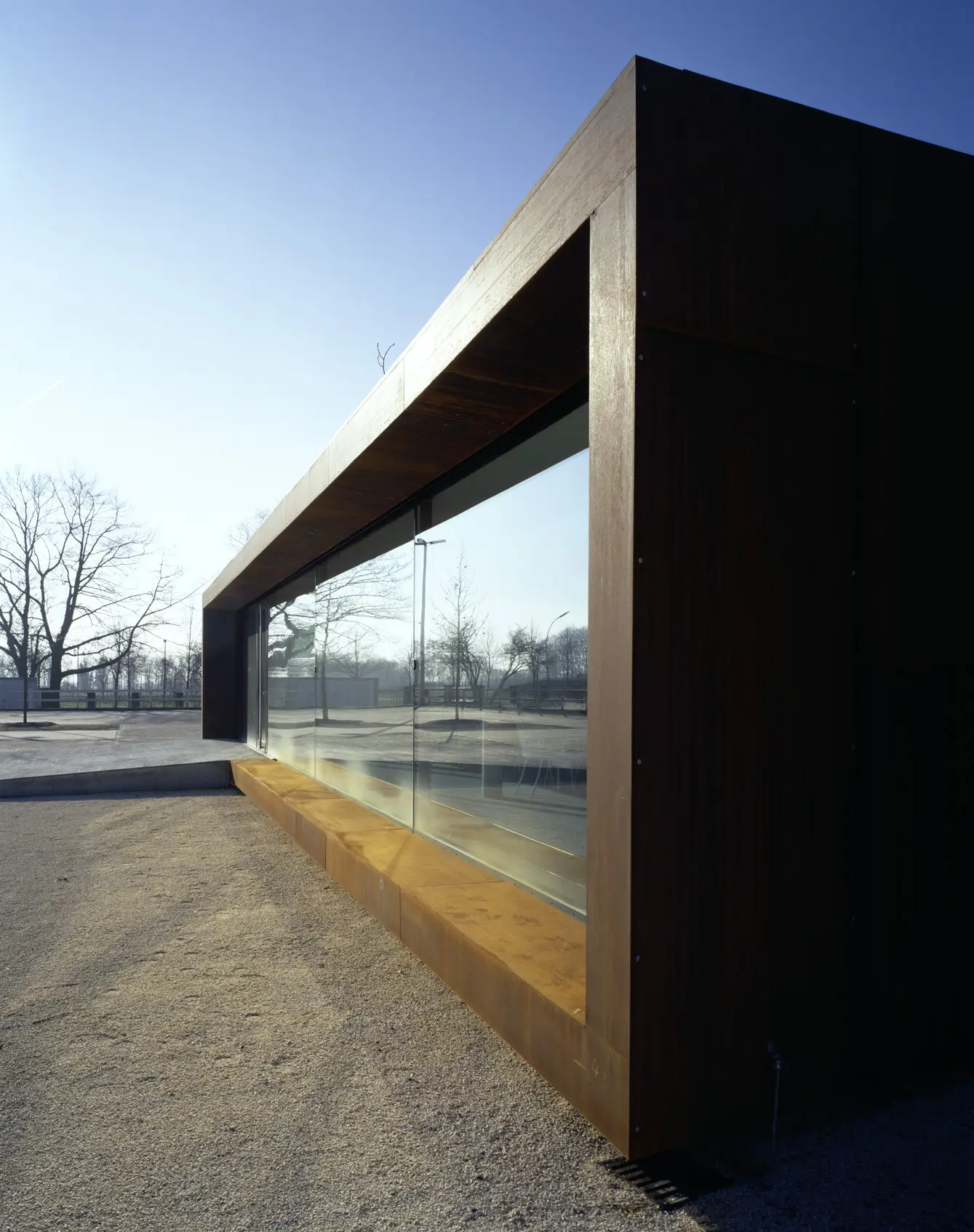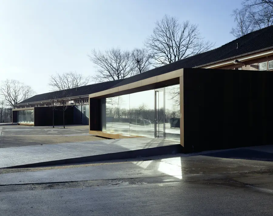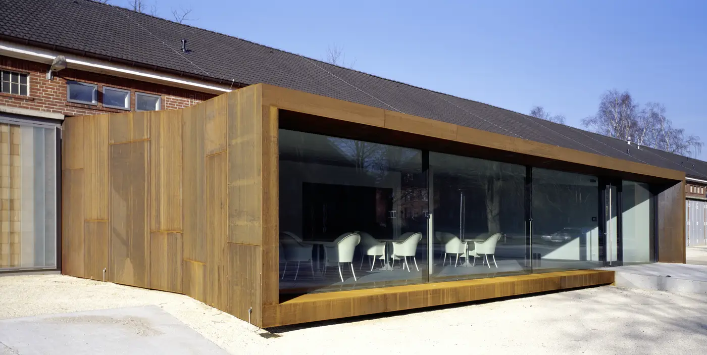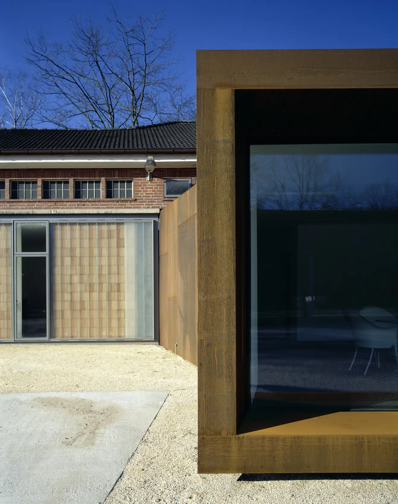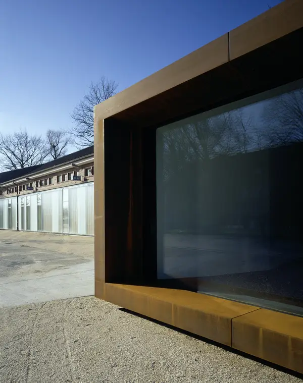 Die Eingangsbereiche wurden als eingeschossige, aus dem alten Baukörper herauswachsende Öffnungen mit einer geschosshohen, rahmenlosen Verglasung ausgebildet, die von einer Corten-Stahlhaut umschlossen sind. Durch diese ruppige Materialität respektiert der Anbau die bestehende Halle und verbindet sich mit ihr.