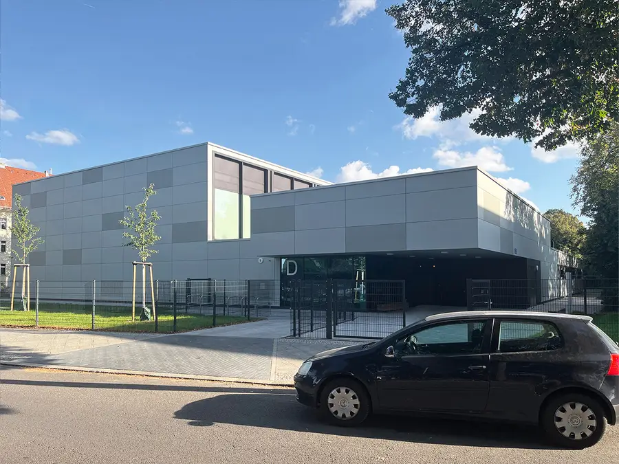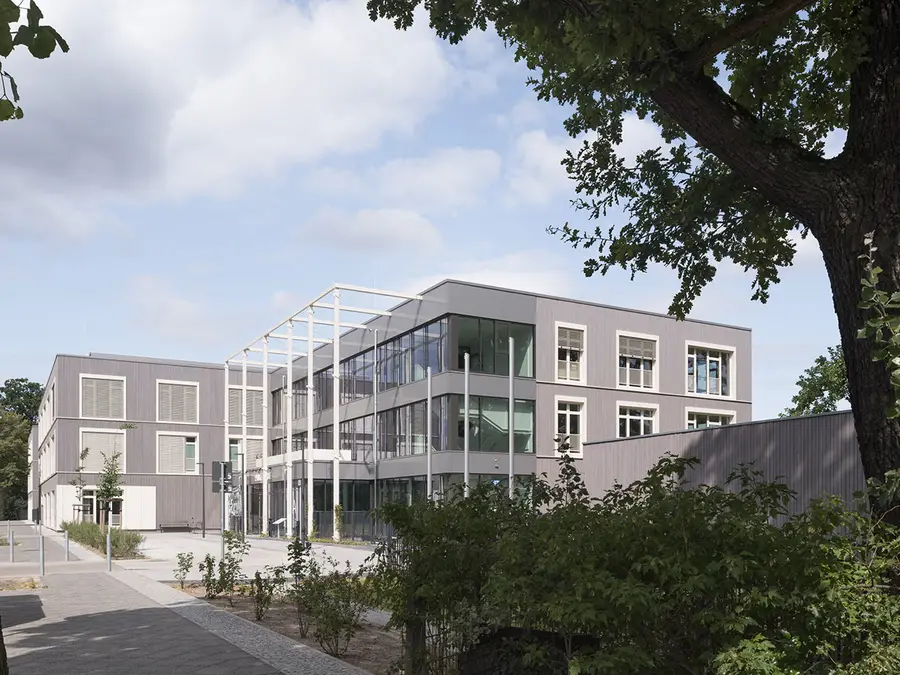 Die Baumaßnahme wird in zwei Bauabschnitten auf zwei Grundstücken realisiert. Nach Fertigstellung des Schulgebäudes auf dem Schlossparkgrundstück wird die Sporthalle auf einem Nachbargrundstück errichtet, auf dem während der Bauzeit eine provisorische Containerschule untergebracht war.