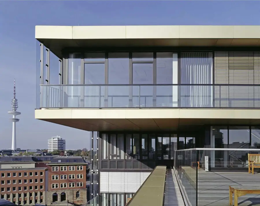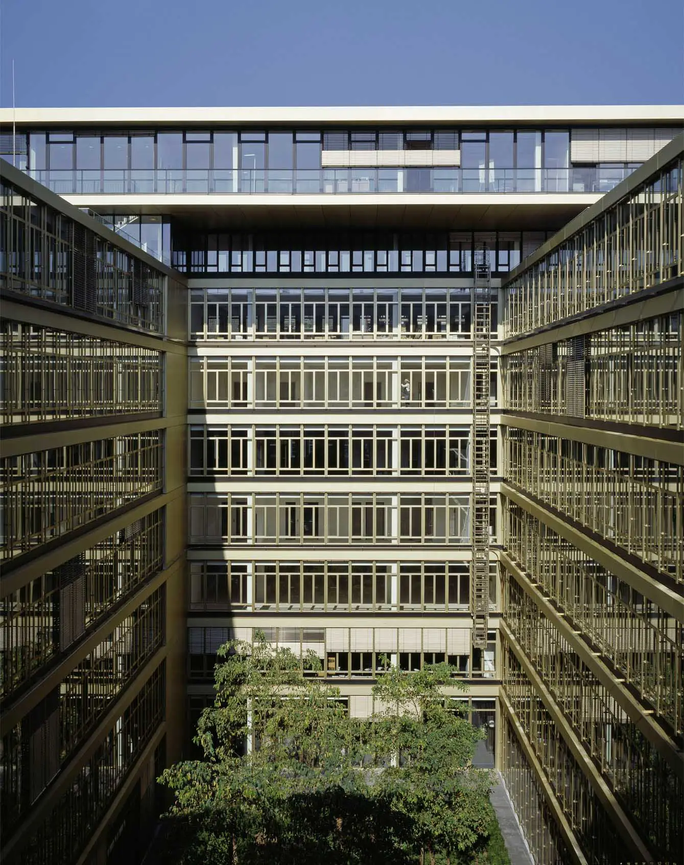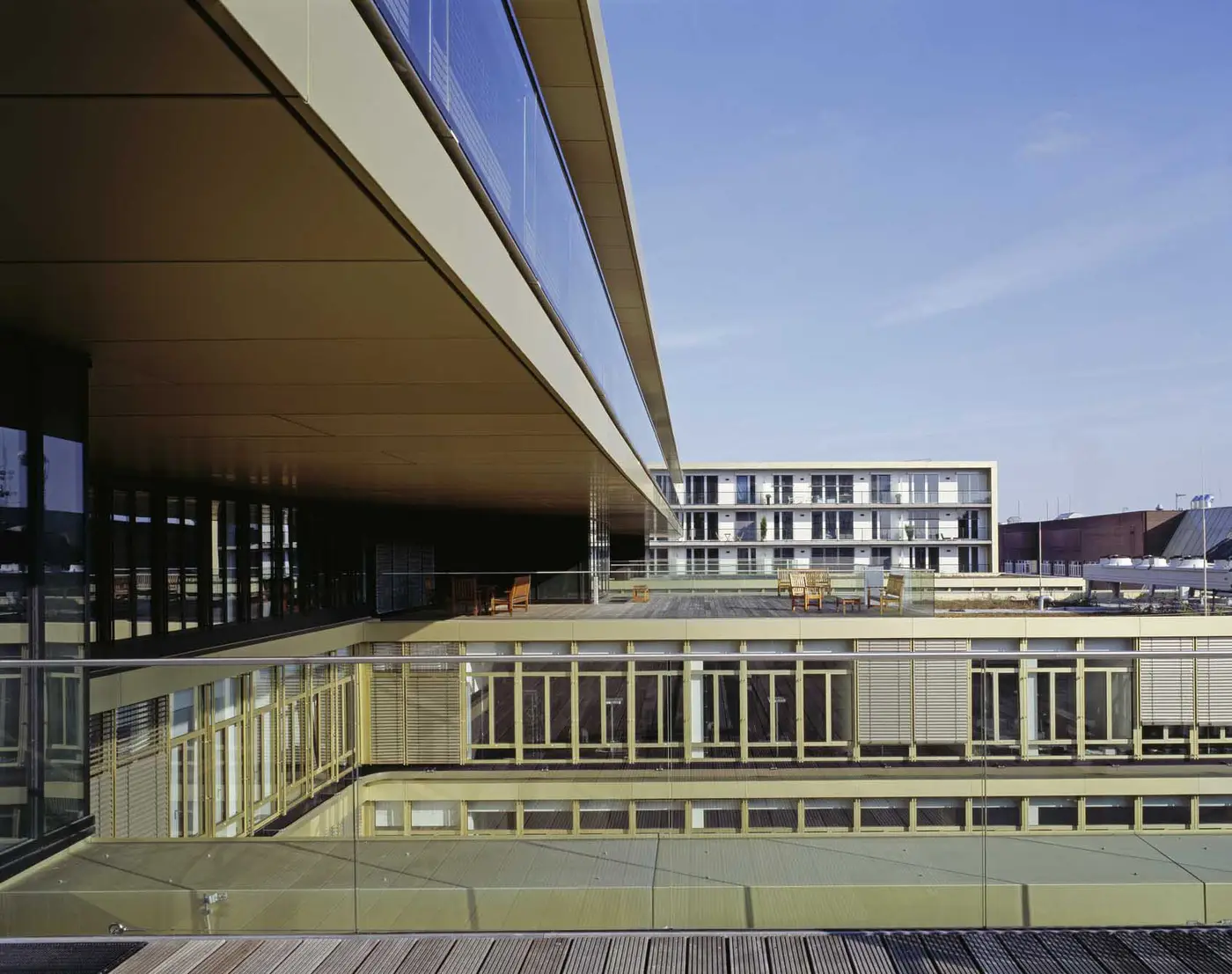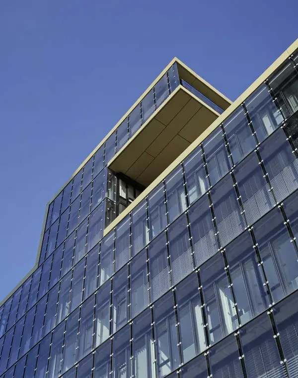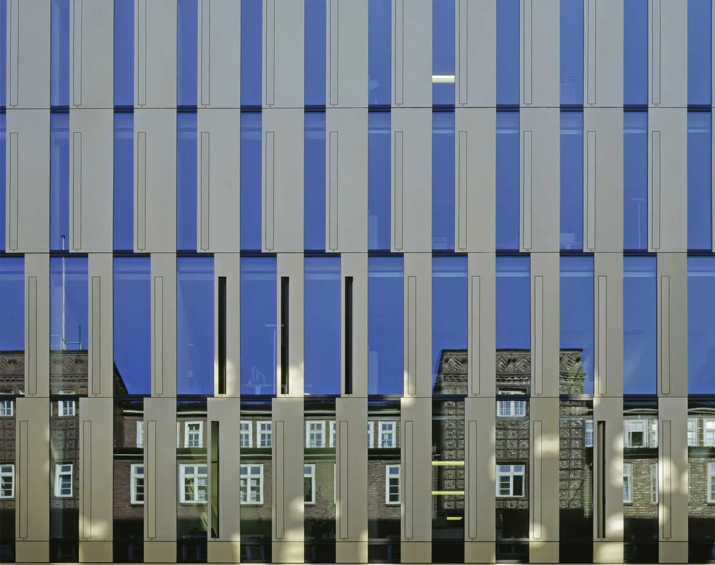 Die Straßen begleitende Fassade wird in geschosshohe vertikale Streifen aus Glas und geschlossenen Paneelen mit integrierten Flügeln gegliedert. Durch minimale Variationen entsteht eine überraschende Dynamik und Irritation in der Wahrnehmung dieser absolut planen und eleganten Fassade.