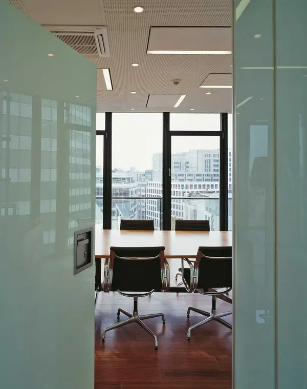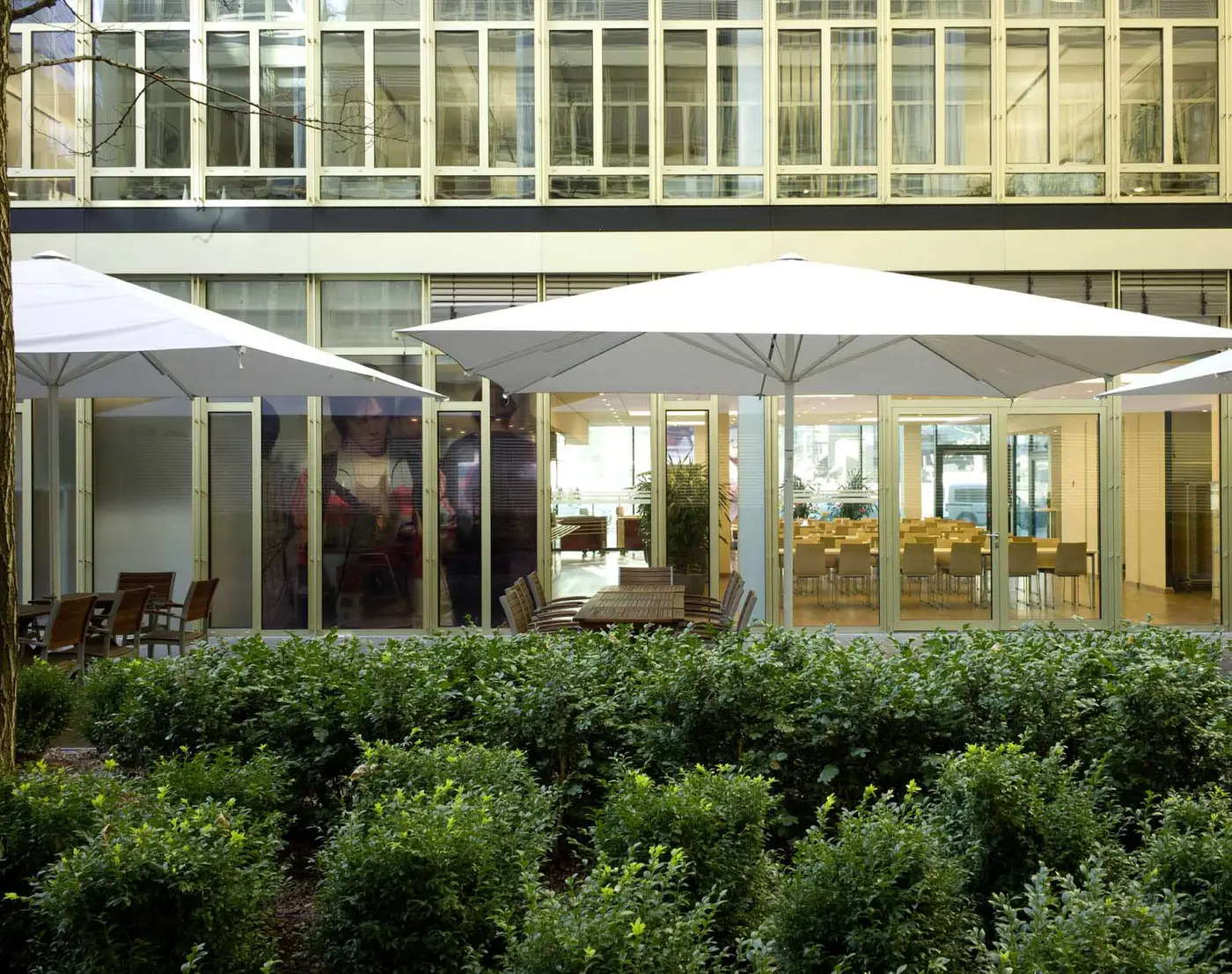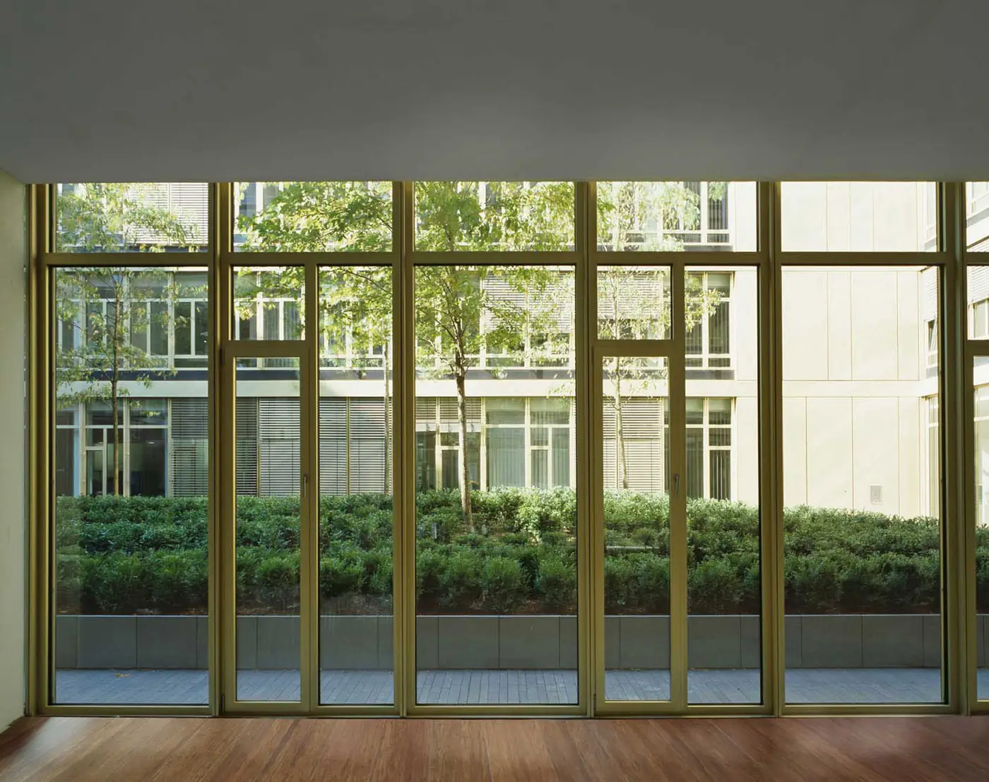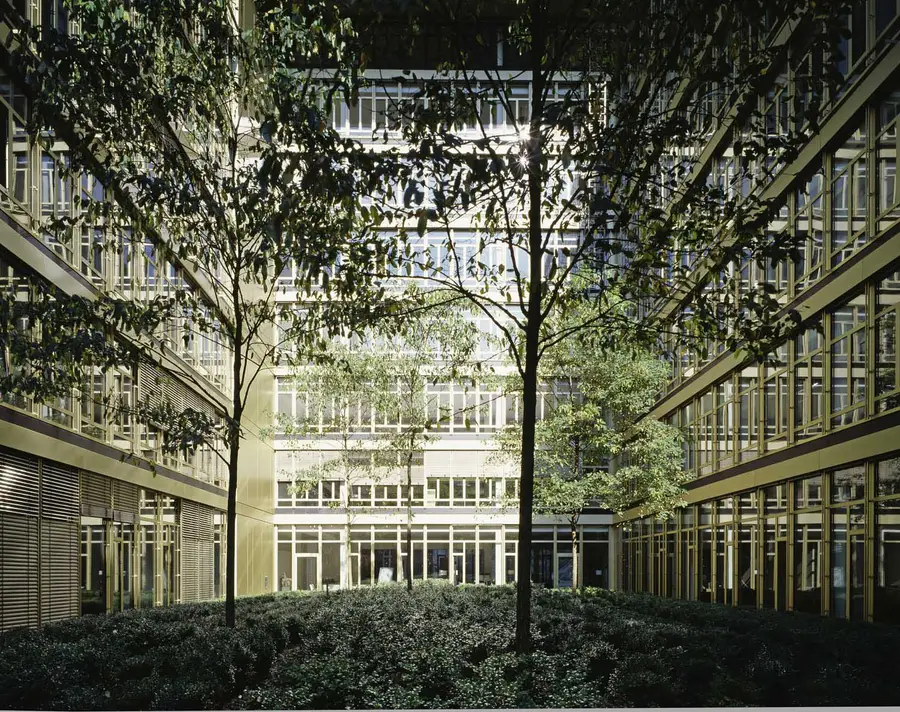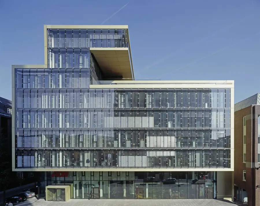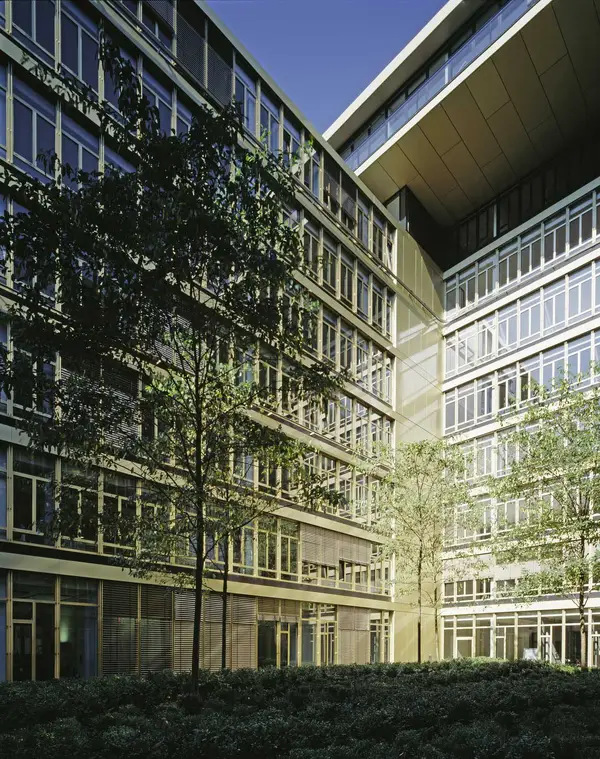 Die Straßen begleitende Fassade wird in geschosshohe vertikale Streifen aus Glas und geschlossenen Paneelen mit integrierten Flügeln gegliedert. Durch minimale Variationen entsteht eine überraschende Dynamik und Irritation in der Wahrnehmung dieser absolut planen und eleganten Fassade.