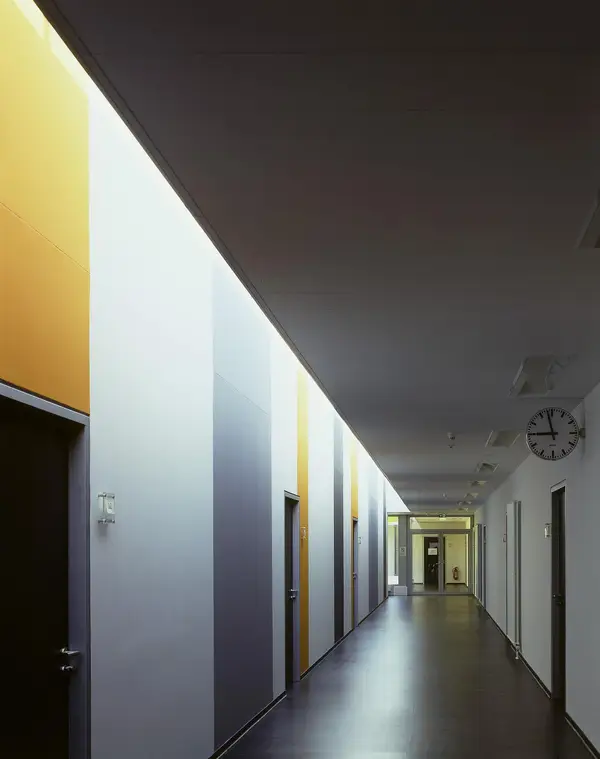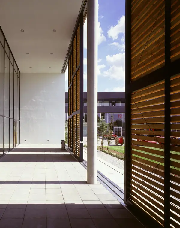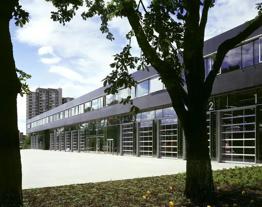 Das zweigeschossige Hauptgebäude am Marbachweg gibt der Feuerwehr mit seinen klaren und eindeutigen Raumkanten eine noble Präsenz im Stadtraum, ohne seine Umgebung zu dominieren. Es umfasst einen großzügigen Innenhof, von dem alle Bereiche erschlossen werden.