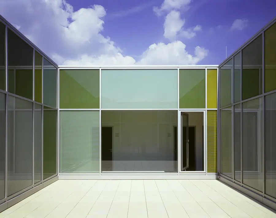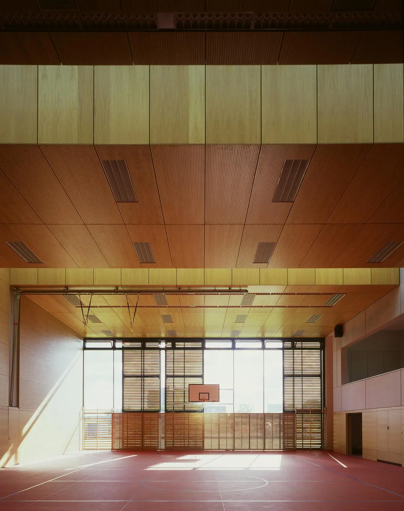 Restaurant, Sporthalle und Gästeappartements sind in einem separaten Baukörper angeordnet, der sich nördlich anschließt und etwas zurückgesetzt ist, um seine Eigenständigkeit zu betonen.