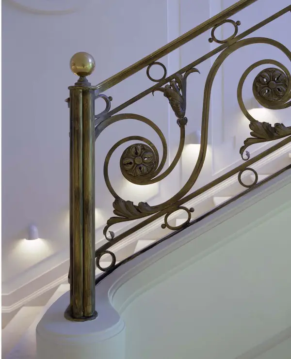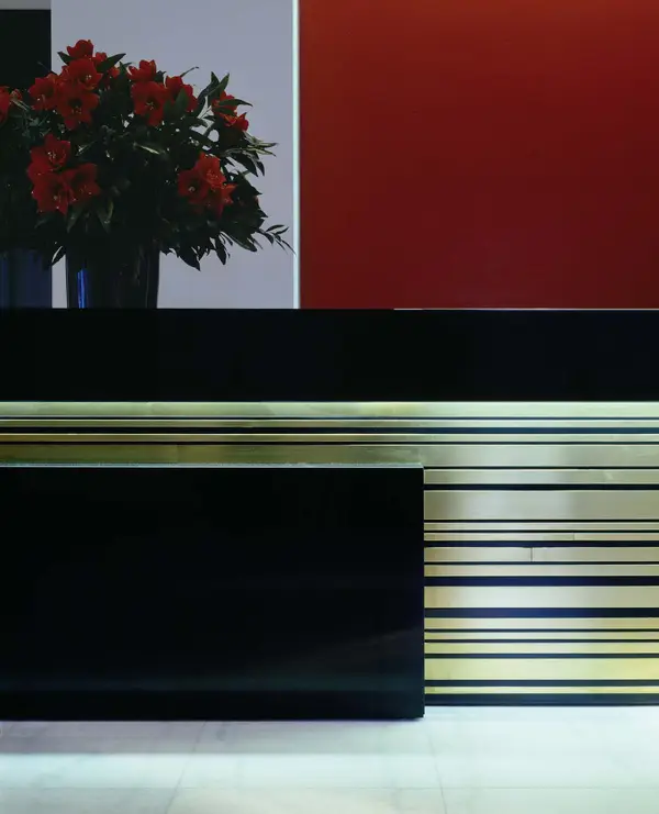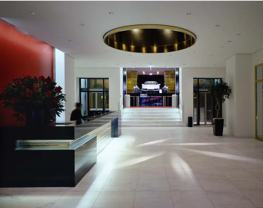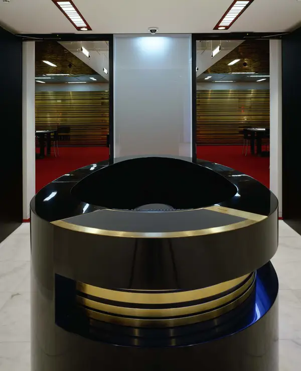 Das historische Raumgefüge mit seiner Axialität und den beeindruckenden Raumfolgen im Erdgeschoss und die zentrale Treppe wurden wiederhergestellt. In den Wand- und Deckenbekleidungen aus Messinglamellen, hochglanzlackierten oder lederfurnierten Tafeln wurde die aufwändige Gebäude- und Sicherheitstechnik und die Beleuchtung integriert.
