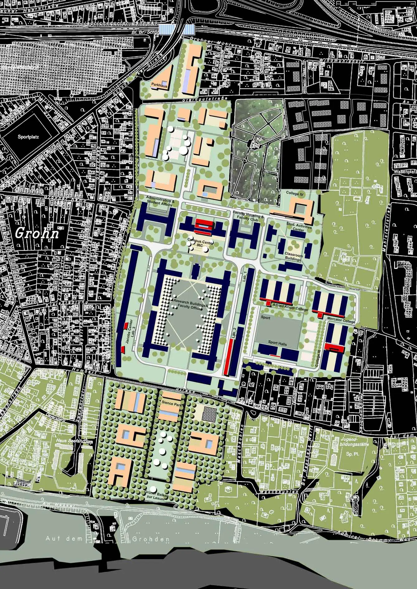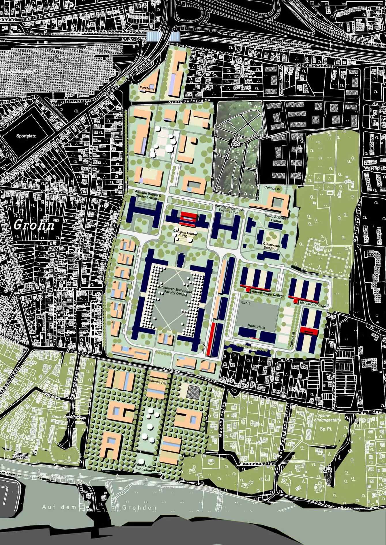 Die Einbindung des Campus in die angrenzenden Wohngebiete soll außerordentlich behutsam erfolgen und keineswegs Grenzen und Eigenschaften verwischen. In der kleinmaßstäblichen Bebauung der Wohngebiete erhält der Campus durch seine großzügigen Räume und Bezüge eine besondere Identität. Das Thema “Gebäude im Park" bestimmt den Charakter des Campus.