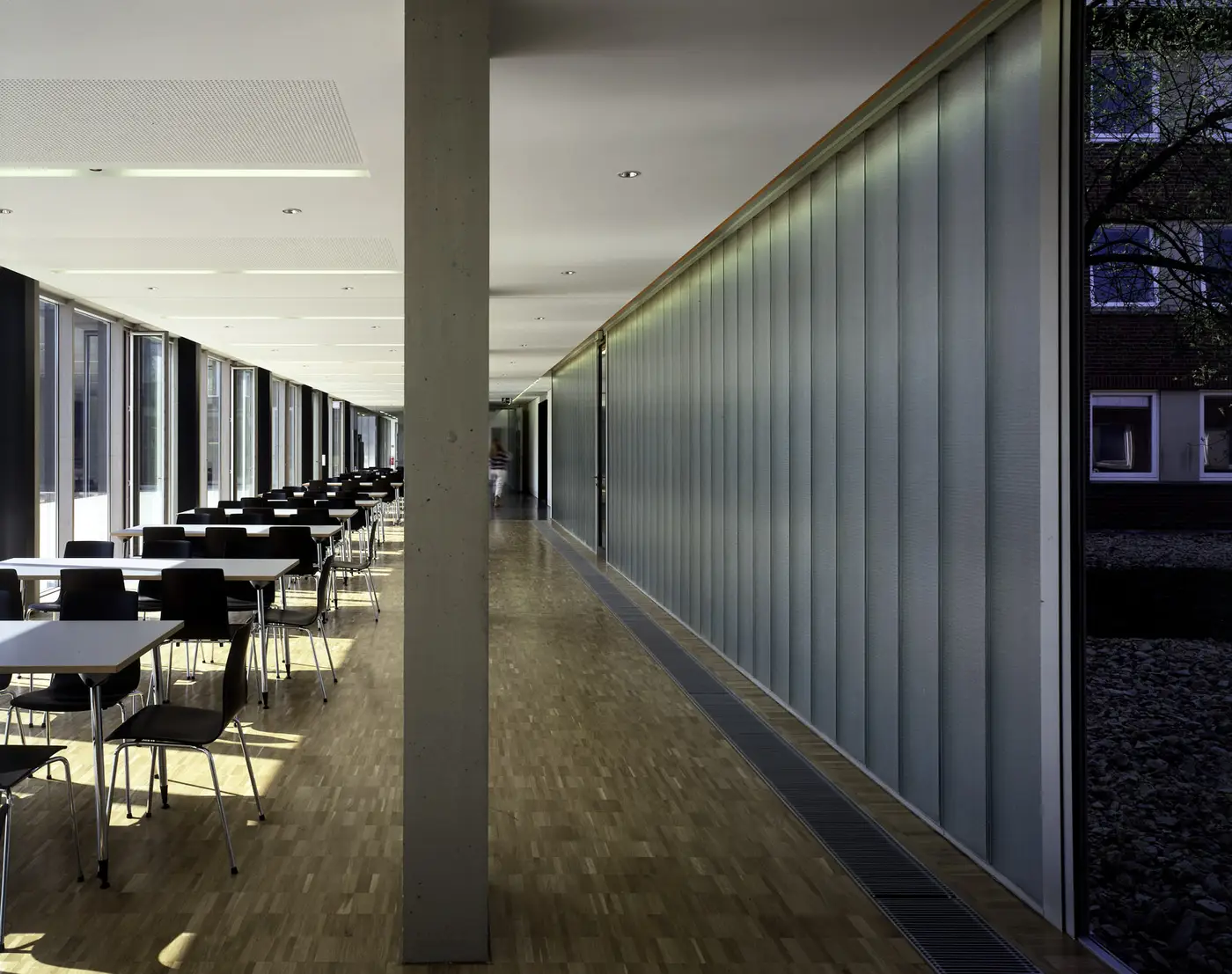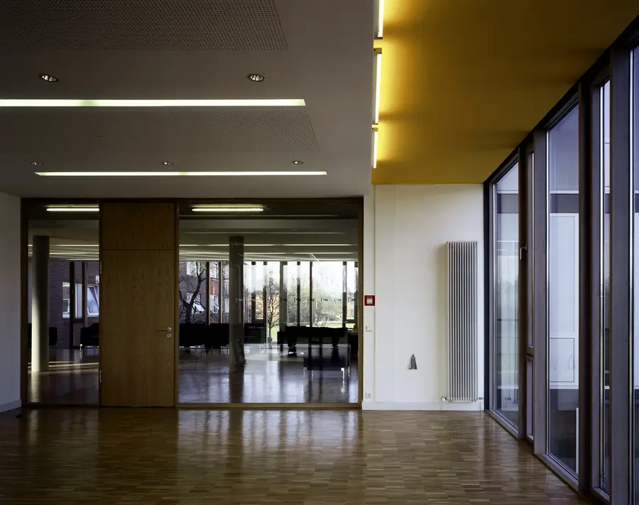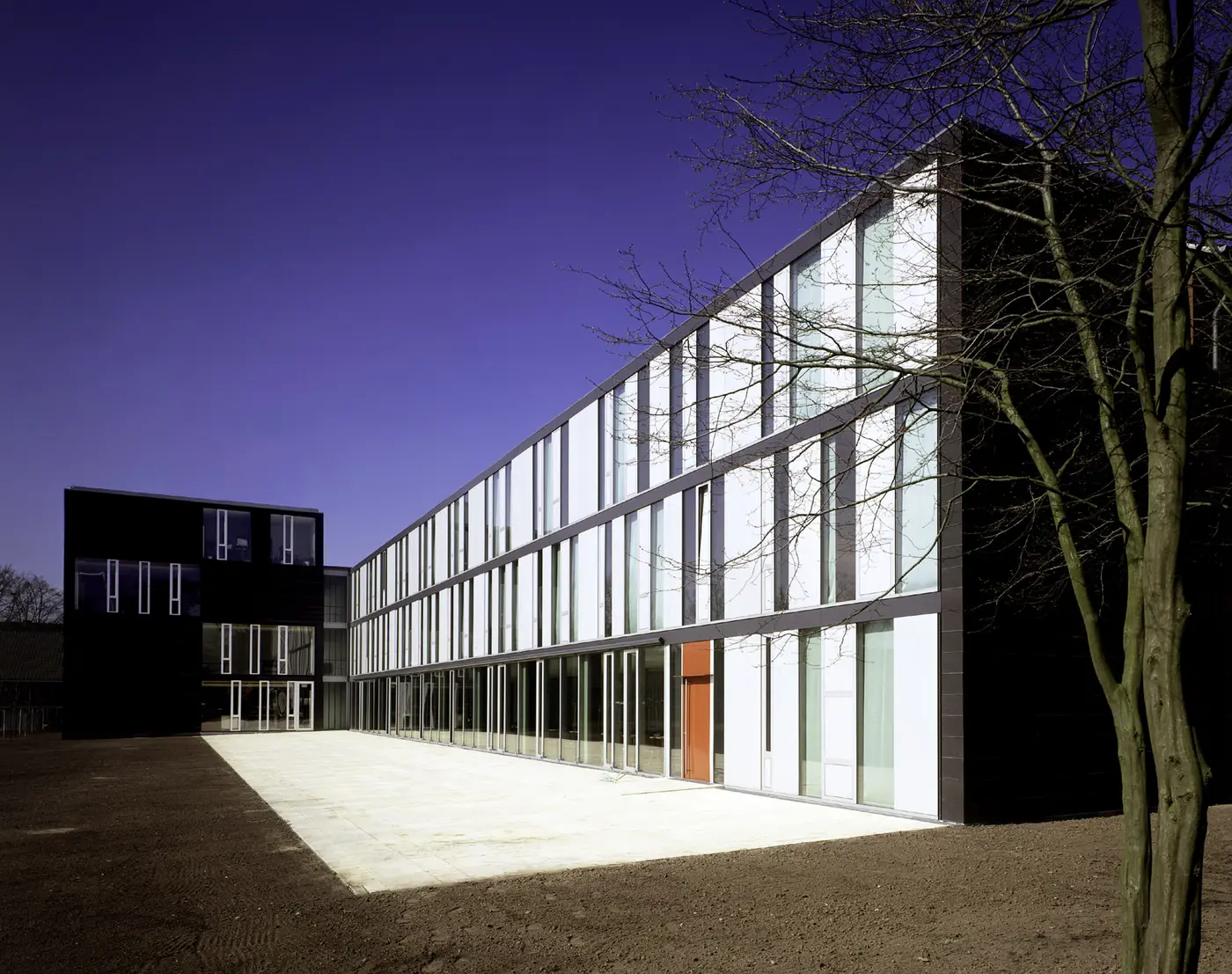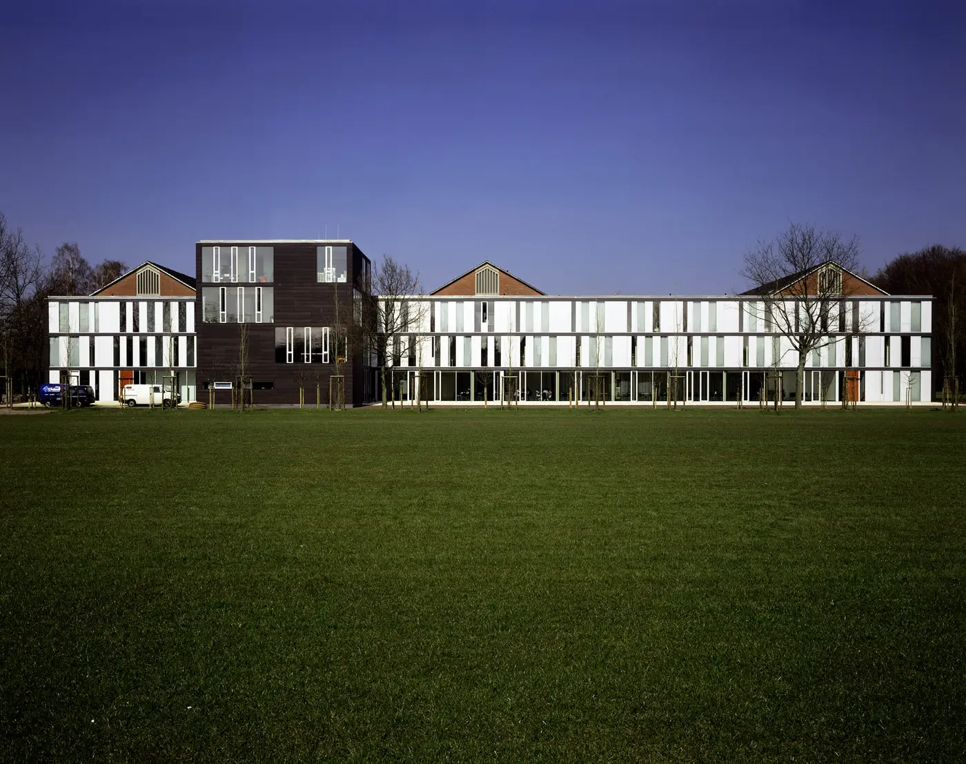 Ein dreigeschossiger Riegel und ein viergeschossiger Kubus verbinden die Altbauten an der Südseite zu einem Gebäude und setzten als erster Neubau auf dem Campus ein architektonisches Zeichen für den Wandel.