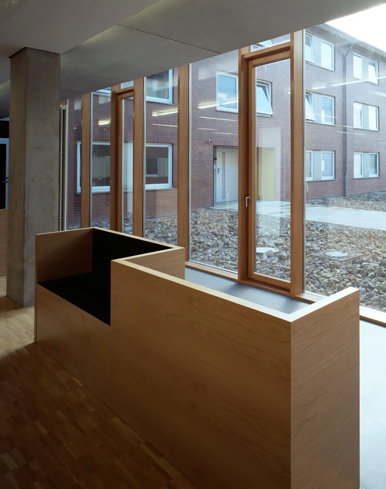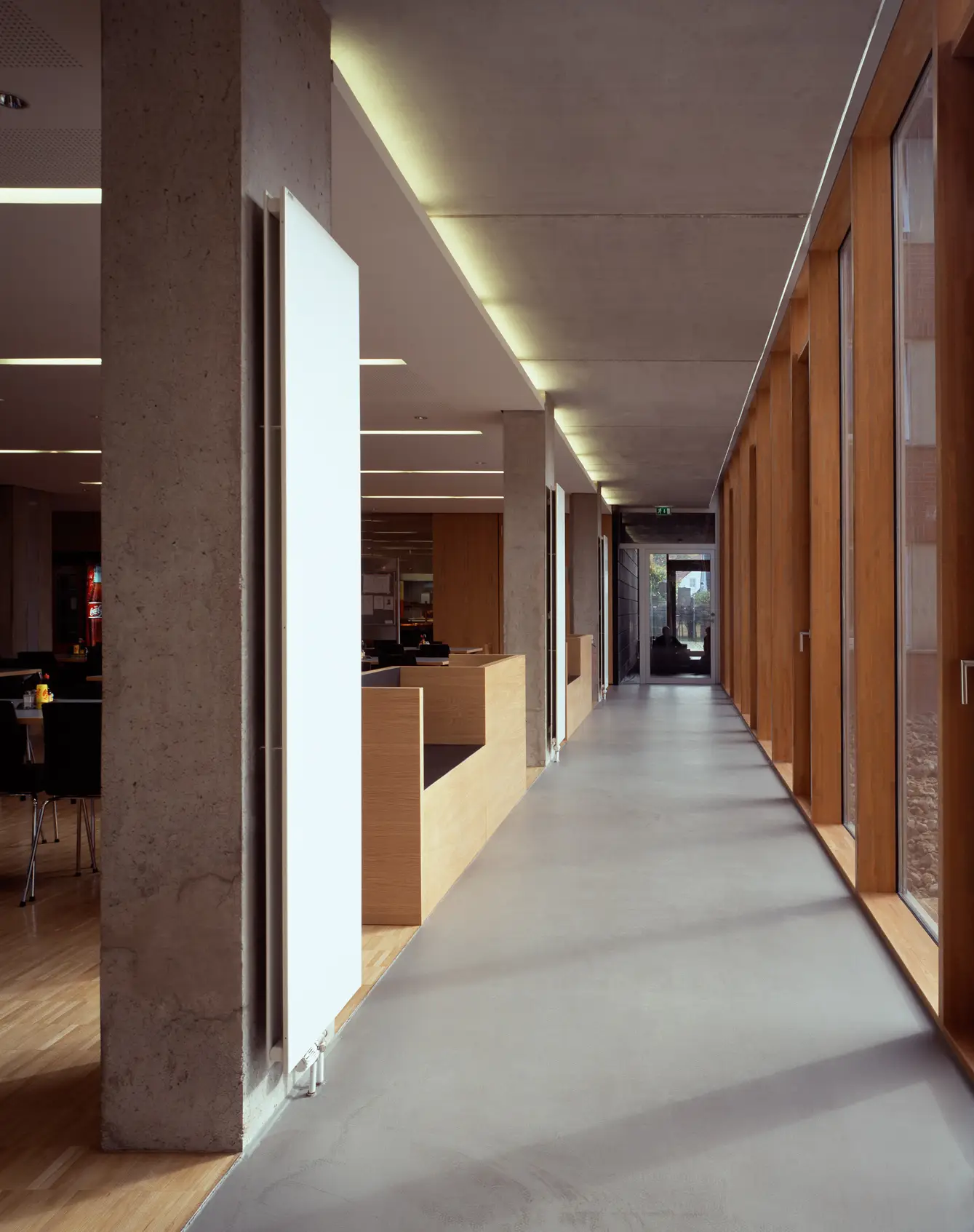 Ein viergeschossiger Baukörper im Mittelbereich verbindet zwei Bestandsbauten zu einem Gebäude und vollendet damit das Gesamtensemble von drei Colleges auf dem Campus der JUB.