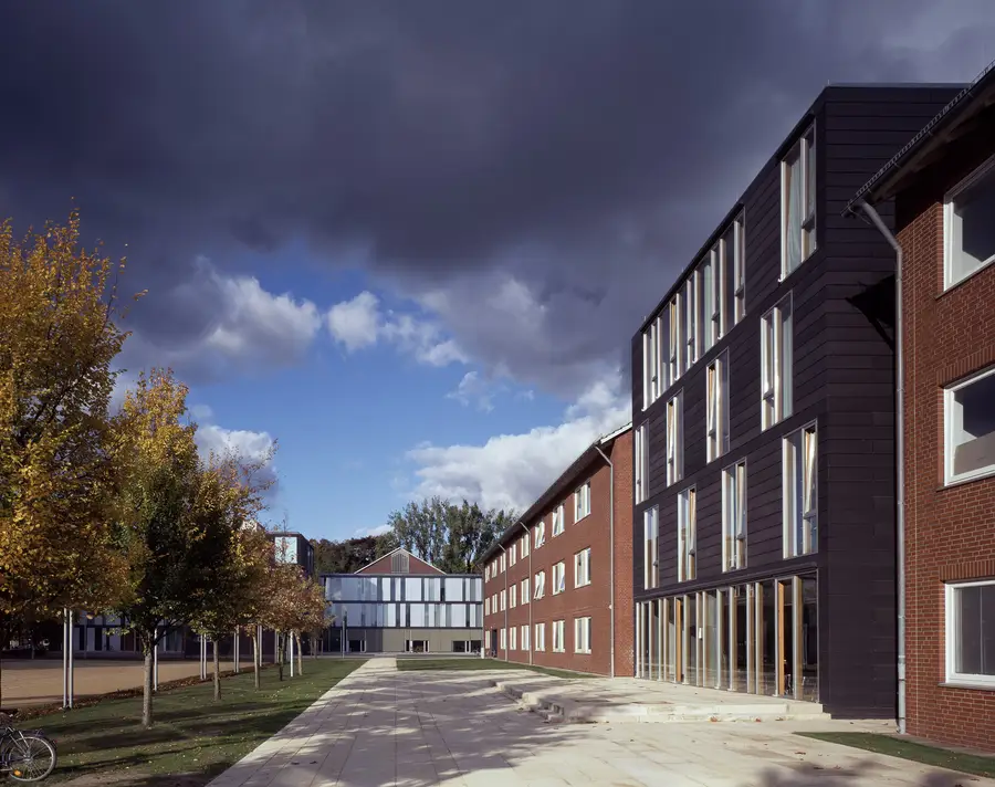 Eleganz und Materialität (schwarzes Zinkblech) des Neubaues bilden wie bei den anderen Colleges einen deutlichen Kontrast zu den Ziegelbauten. Durch die andere Konfiguration der Baukörper erhält dieses College jedoch eine ganz eigene Präsenz auf dem Campus.