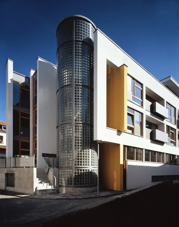 Die architektonische Auseinandersetzung mit dieser Situation, den vorhandenen Altbauten und der Ecklage prägt die Architektur des Gebäudes.