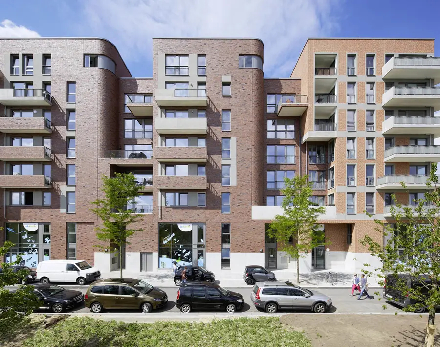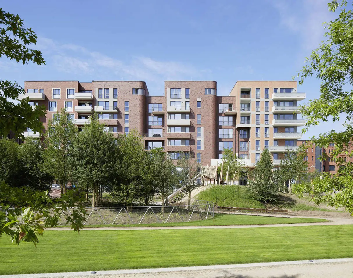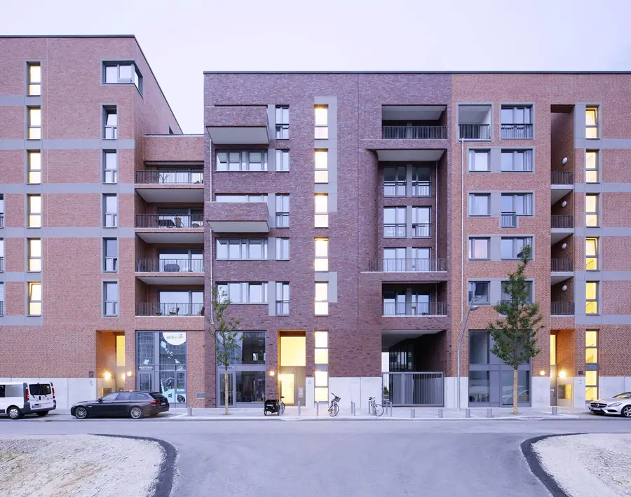 Für die Umsetzung der Materialvorgabe „roter Ziegel“ dient als Referenz die neobarocke Architektur Hamburgs, wie z.B. das HHLA-Gebäude in der Speicherstadt, die mit ihrem Spiel von Ziegel und Naturstein besonders geeignet zu sein scheint, ein gleichermaßen anspruchvolles wie wohnliches Ambiente zu erzeugen.