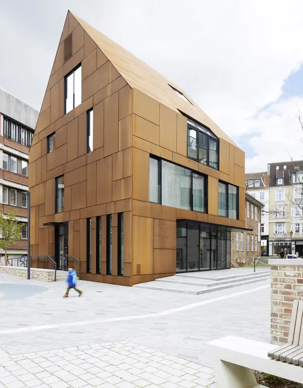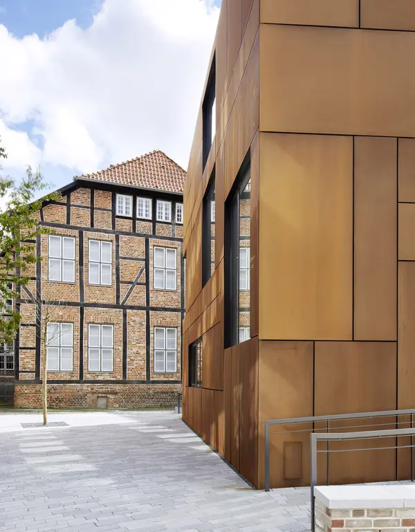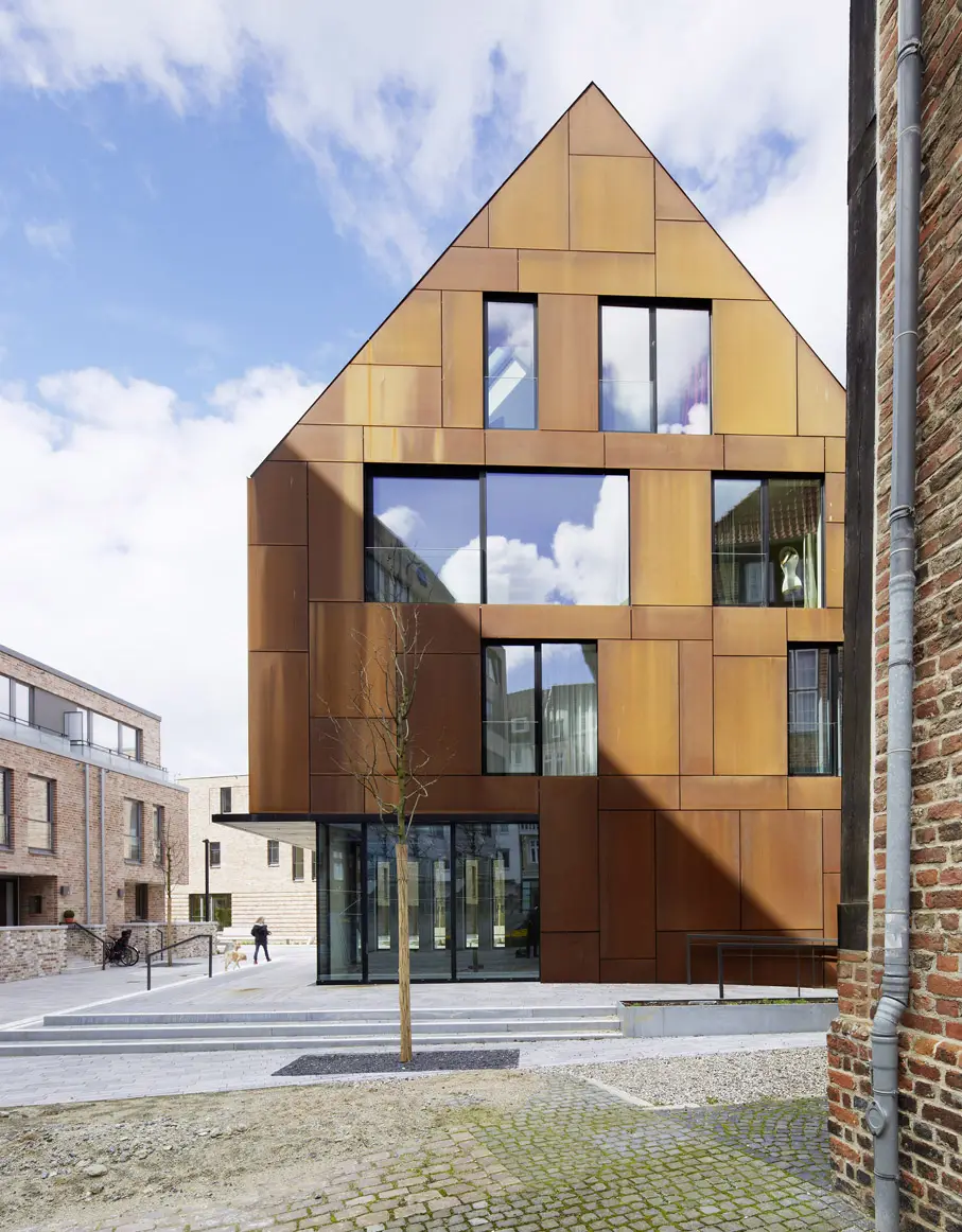 Südlich, dem Kulturdenkmal „Warleberger Hof“ benachbart, bildet ein vollständig mit Cortenstahl bekleidetes Satteldachhaus mit zwei exklusiven Loftwohnungen und einer Gewerbeeinheit im Erdgeschoss eine eigenständigen Akzent und markiert den städtischen Zugang zum Quartier.