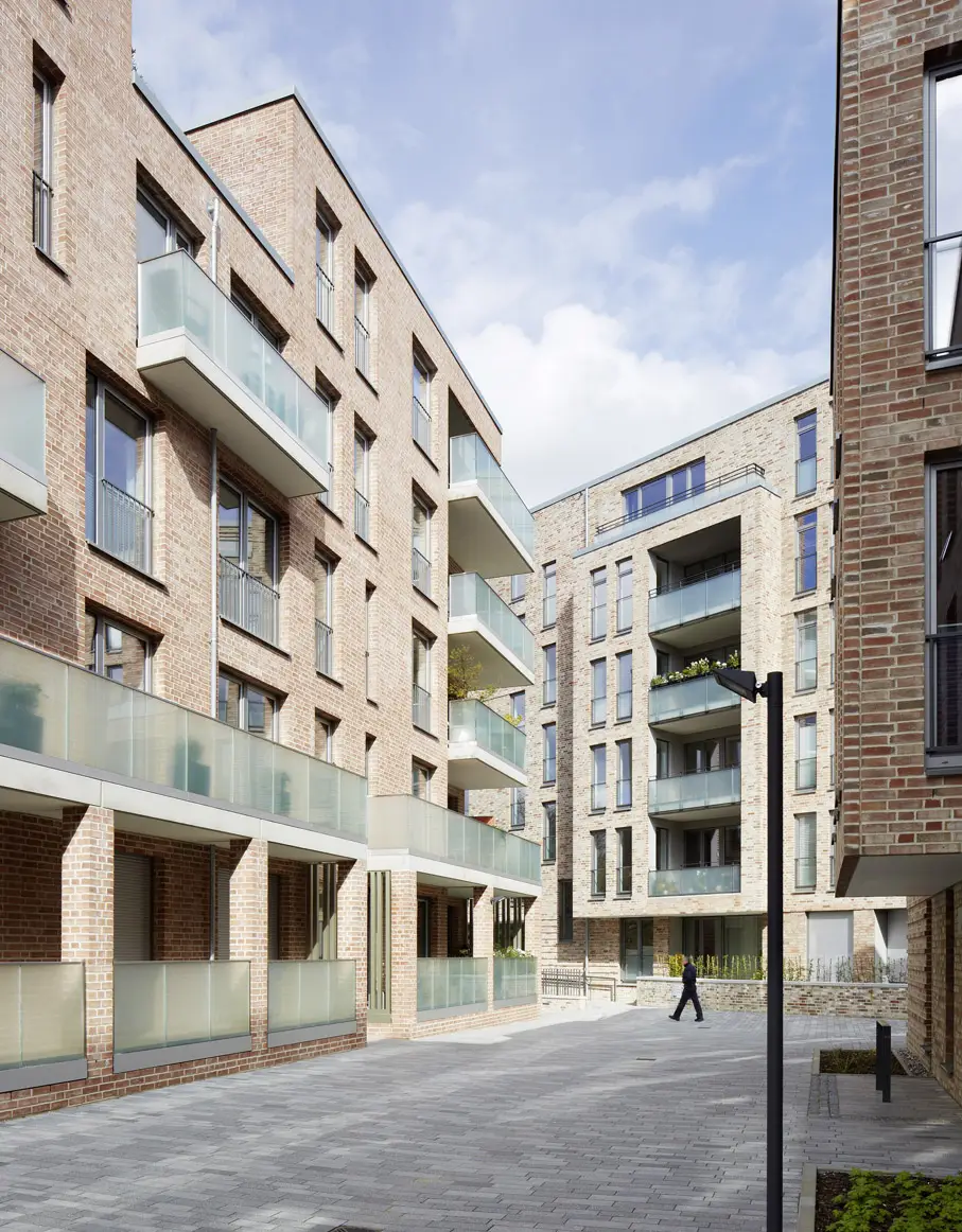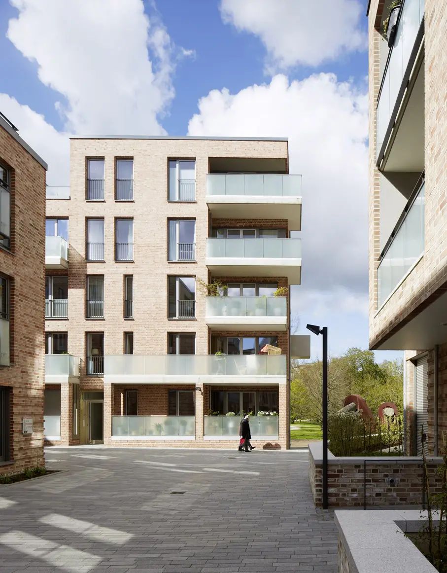 Zwei der sieben Baufelder werden von BLK2 Architekten entwickelt. Angrenzend an den Ratsdienergarten und den Kleinen Kiel bilden zwei fünfgeschossige Mehrfamilienhäuser den nördlichen Abschluss am Jensendamm und bieten 19 attraktive Wohnungen mit Blick zum Park. Einschnitte der Dachterrassen gliedern den Baukörper, roter Ziegel vereint alle Häuser und fügt das Quartier in das Stadtbild.