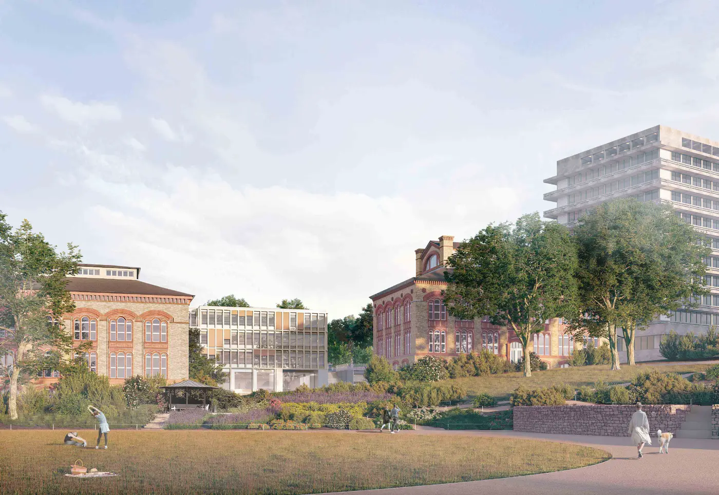 höhergelegen Patientengarten durch sein terrassiertes Sockelgeschoss vermittelt.