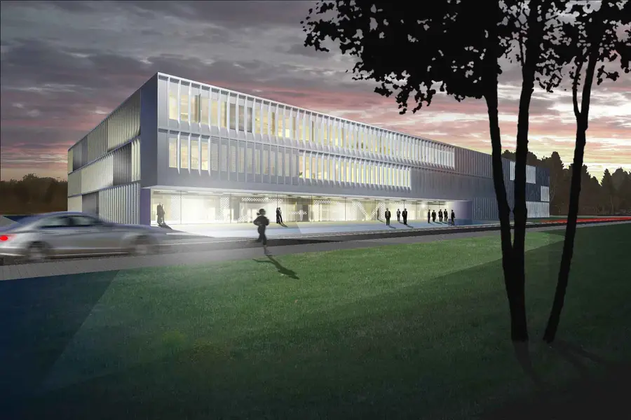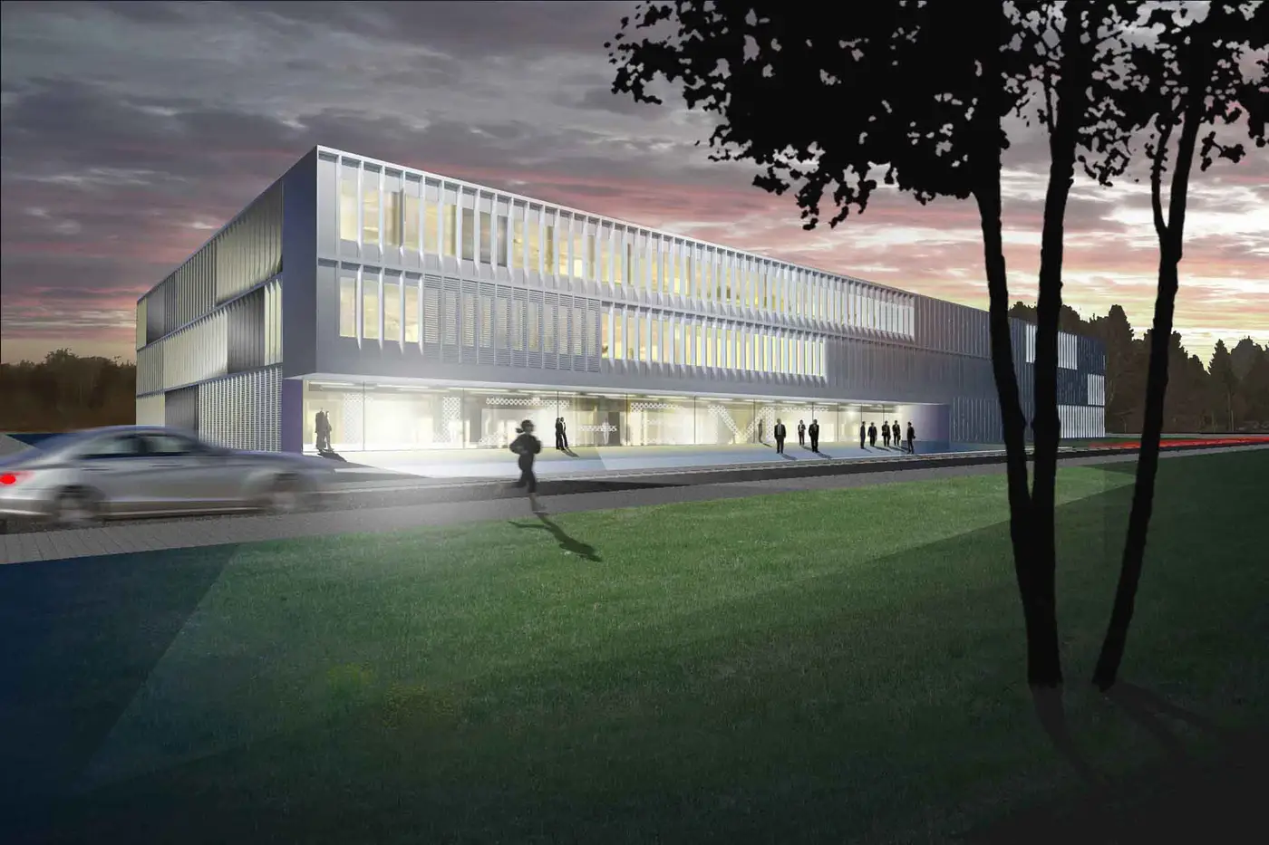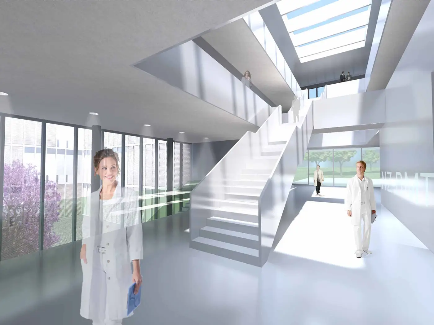 Die rationale Klarheit der Fassade und die weiße Farbe charakterisieren Inhalt und Bedeutung seiner Funktion. Die Mitte des Hauses erhält mit einer kleinen, dreigeschossigen Halle ein kommunikatives und zurückhaltend repräsentatives Zentrum