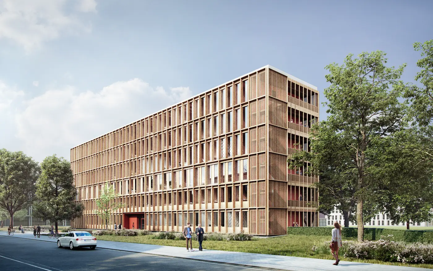 Das 6-geschossige Gebäude ist unter der Zielsetzung einer optimierten CO2-Bilanz in modularer Holzhybridbauweise mit aussteifendem Stahlbetonkern geplant.