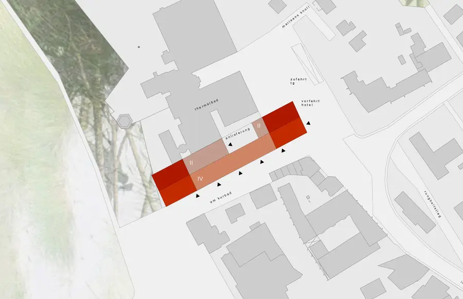Ein viergeschossiger Baukörper entlang der Straße Am Kurbad erhält an beiden Enden einen fünfgeschossigen, giebelförmigen Aufbau, der sowohl zum Ort als auch zum Meer eine einprägsame, fast archetypische Form erzeugt, wie sie auch in den typischen Bauten der nordfriesischen Landschaft, z.B. den Haubargen, angelegt ist. Diese einfache, vertraute Form wird jedoch durch die Verwendung von rot bedruckten, semitransparenten Gläsern für die Fassaden- und Dachflächen zu einem ungewöhnlichen und neuen Objekt, und damit zu einer modernen, zeitgenössischen Architektur.