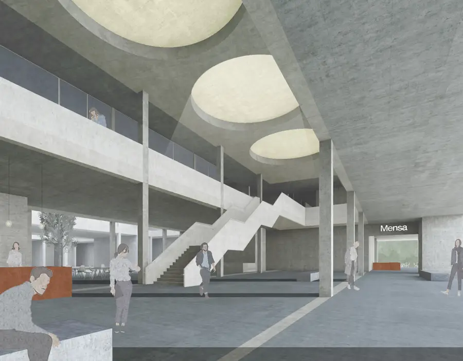 Eine zentrale Erschließungsachse mit Empfang, Cafeteria und Unterrichtsräumen gliedert die großen Werkstattbereiche im Erdgeschoß in einen technischen Bereich nach Osten und einen Lebensmittelbereich an der Kronsdorfer Landstraße.