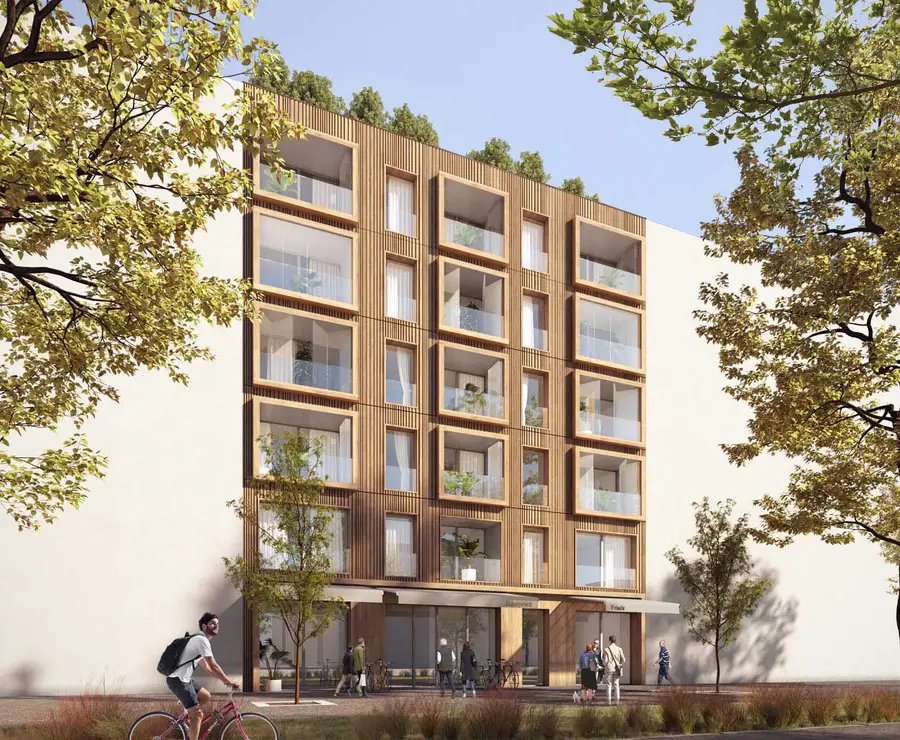 An der Hauptverkehrsachse gelegen gibt das Haus mit seiner Holzfassade ein Statement zum ökologischen Anspruch des neuen Quartiers Neckarbogen. Durch eine Holzhybridkonstruktion, den gemeinschaftlich genutzten Dachgarten mit Gewächshaus und mit der Wahl von Holz für den Innenausbau wird ein nachhaltiges Konzept mit hoher Wohnqualität umgesetzt.