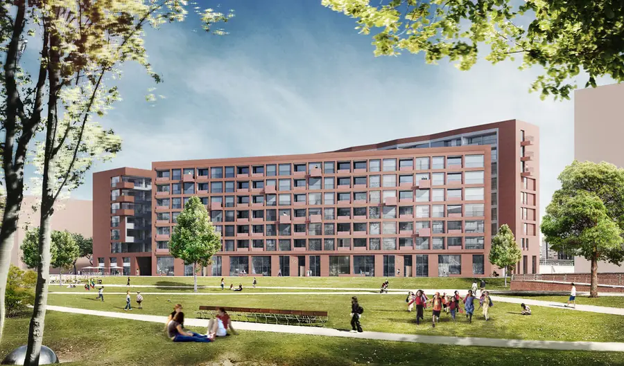 - der Flügel an der Bahntrasse, der für den geförderten Wohnungsbau vorgesehen ist, wird um zwei Geschosse erhöht, wodurch nicht nur ein städtebaulicher Akzent entsteht, sondern auch ein zusätzlicher Anteil hochwertiger Wohnungen, ohne Beeinträchtigung der anderen Bereiche,