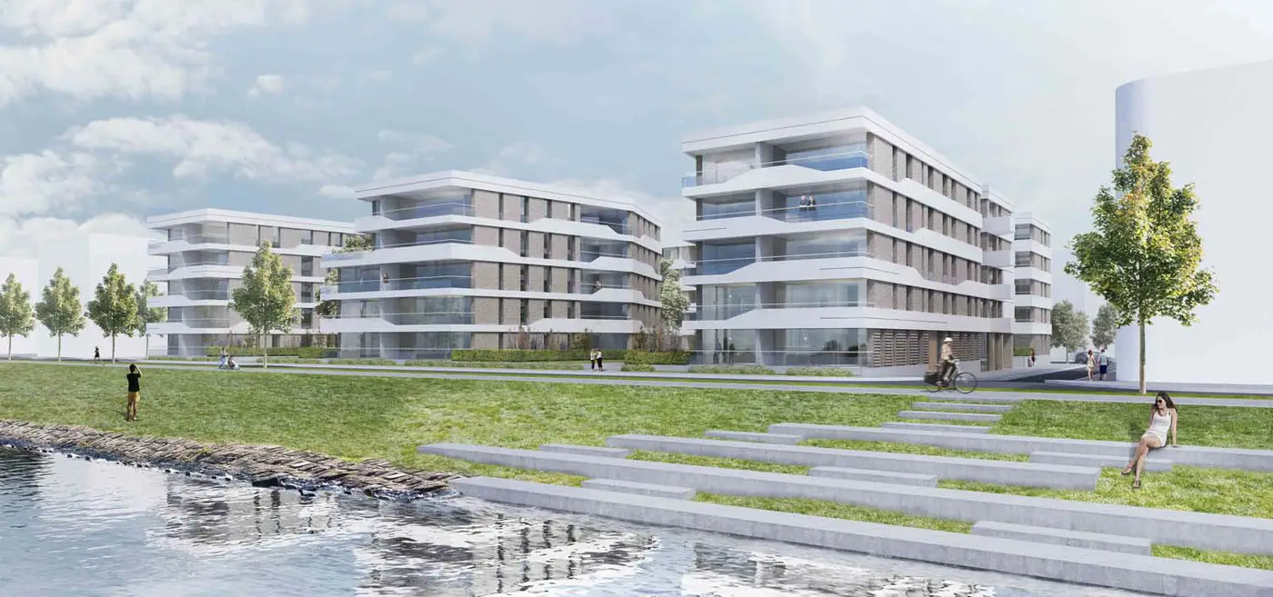 Das städtebauliche Schema an der Hafenkante ist mit seiner Straßen begleitenden Bebauung und der Öffnung zum Wasser einfach und klar. Durch die immanente Wiederholung des Prinzips entsteht die Gefahr eines reinen Nebeneinanders der Bauten mit spannungslosen Außenräumen. Deshalb versucht der Entwurf, das Schema insbesondere im Innenbereich des Baufeldes zu modifizieren.