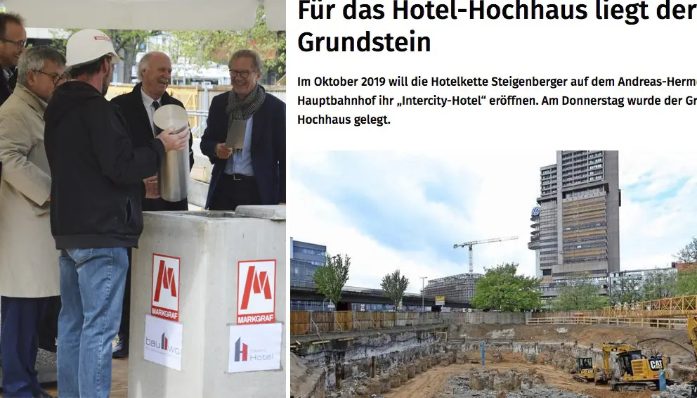 Es geht zügig voran in Hannover! Gestern legte Stadtbaurat Uwe Bodemann gemeinsam mit Steigenberger-Hotelchef Joachim Marusczyk, den Bauwo-Geschäftsführern Bernhard Rückert und Bernd Rathenow, sowie Jürgen Böge den Grundstein für das Intercity Hotel am Hermes Platz.