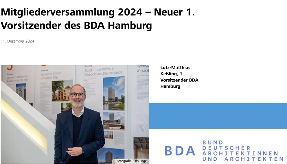 Die Mitglieder des BDA Hamburg haben am 4. Dezember 2024 unseren Partner Lutz-Matthias Keßling einstimmig zum neuen 1. Vorsitzenden gewählt. Er folgt auf Finn Warncke, der nach vierjähriger Amtszeit nicht erneut kandidierte.