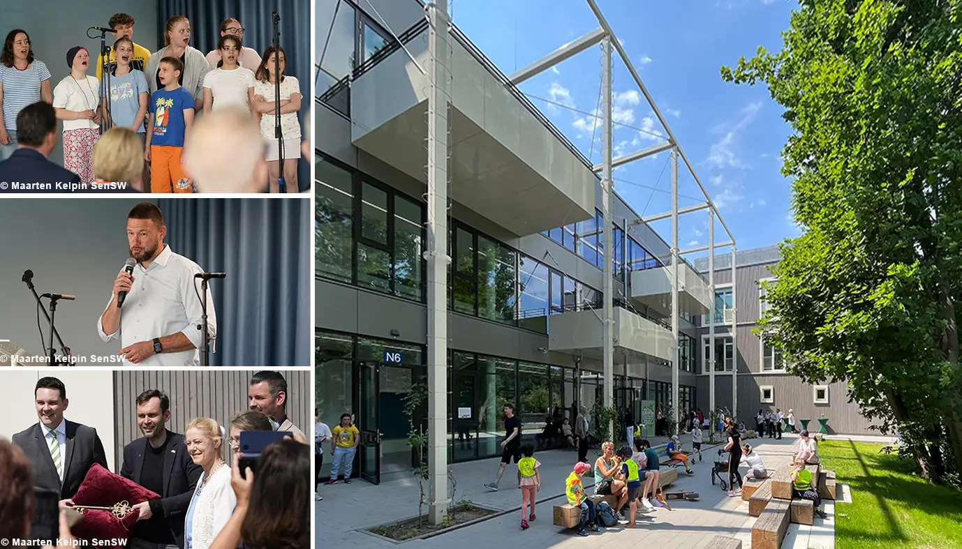 Auf eines ist Verlass. Wenn die Panke-Schule feiert, dann scheint die Sonne! Gestern fand mit reger Beteiligung der SchülerInnen, Ansprachen und Empfang im Hof die offizielle Einweihung und Schlüsselübergabe statt. / Juni. 2023