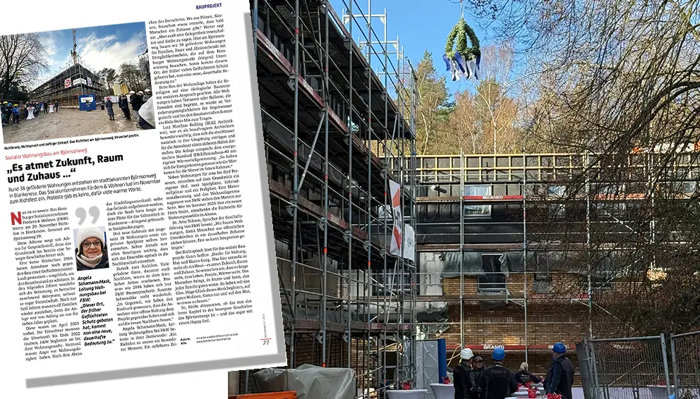 Am 20. November 2025 feierten wir gemeinsam mit vielen Gästen das Richtfest unseres Projekts am Björnsonweg. Die Adresse hat eine bewegte Geschichte: Einst Standort einer Unterkunft für Geflüchtete, entsteht hier nun ein neues Zuhause für viele Menschen – drei Gebäude mit insgesamt 38 Wohnungen und einem privaten Spielplatz.