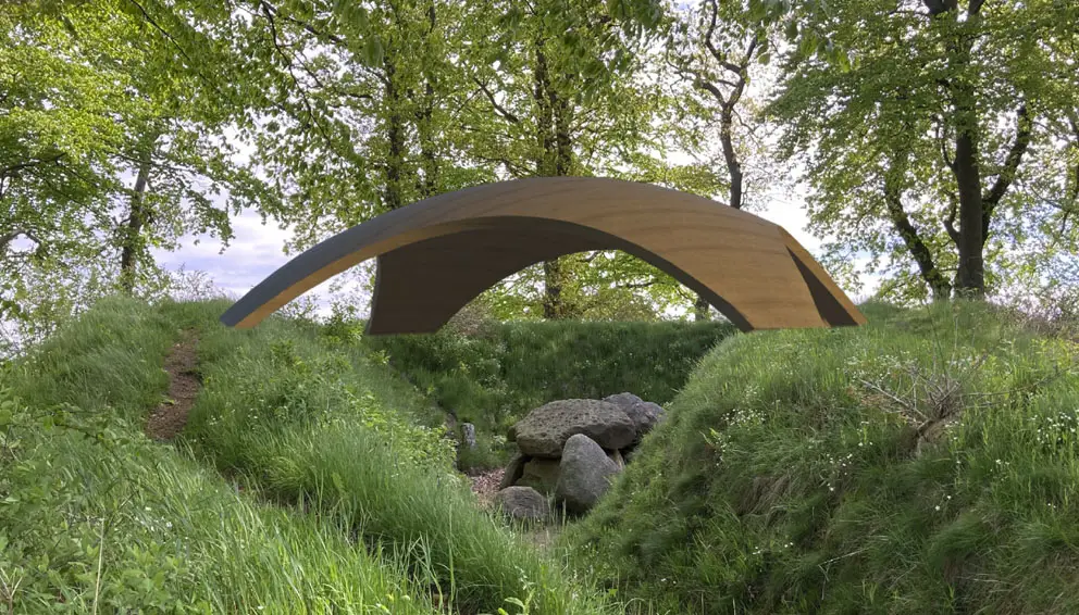 Der Entwurf sieht vor, das Grab mit einer Schale aus Cortenstahl zu überspannen, die die ursprüngliche Geometrie des Hügels andeutet.