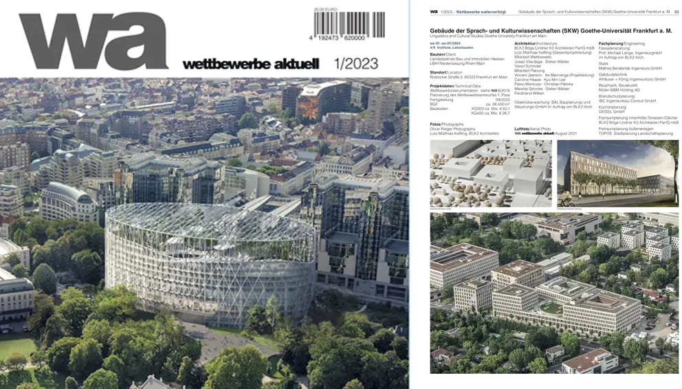 Im aktuellen Heft der Zeitschrift "Wettbewerbe aktuell" wird unser im Herbst 2022 fertig gestelltes Institutsgebäude der Sprach- und Kulturwissenschaften Goethe-Universität Frankfurt a.M. ausführlich vorgestellt.