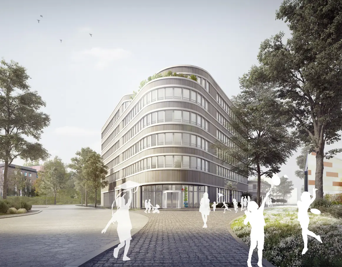 Das Gebäude Elbkinder-Forum schließt städtebaulich an die bestehende Blockrandbebauung im Bereich Daimlerstraße an und führt diese mit einem Schwung in Richtung Paul- Gerhardt Kirche fort. Der Baukörper für Verwaltungseinheiten und Fortbildungsbereiche treppt sich ab und bildet zum Abschluss den Neubau einer zweigeschossigen Kindertagesstätte aus. Der Neubau für die Kita ersetzt den derzeit bestehenden Bestandsbau auf dem Grundstück.