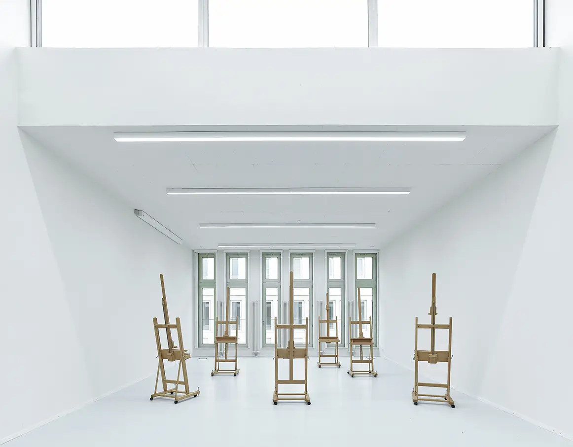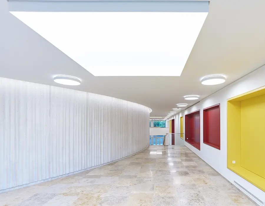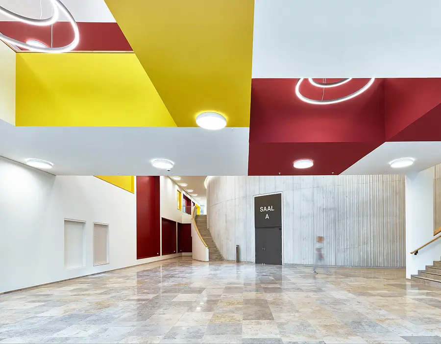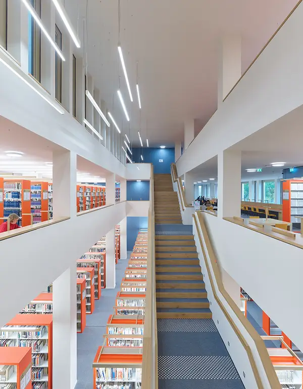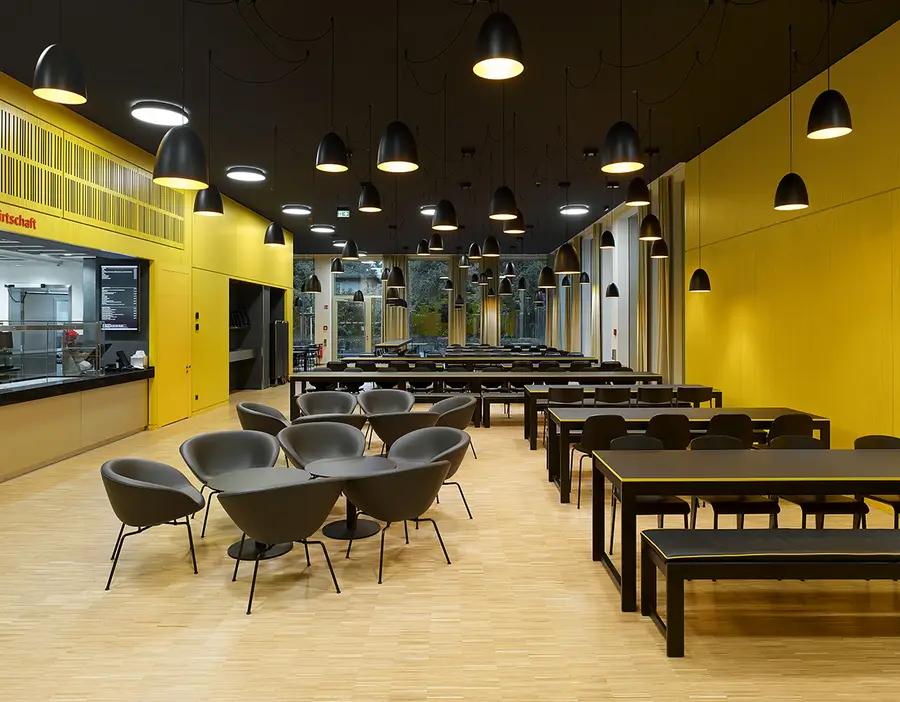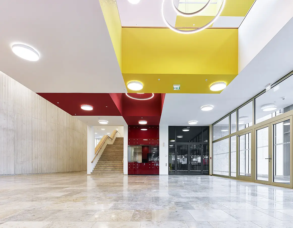 Vom Windfang des Haupteinganges betritt der Besucher das großzügig dimensionierte Foyer, von dem die verschiedenen Funktionsbereiche, der Hörsaal für 700 Personen sowie die Bibliothek erschlossen werden. Im Süden besteht die Möglichkeit der Anlieferung via eines kleinen Hofes für Mensa und ebenerdige Werkstätten.