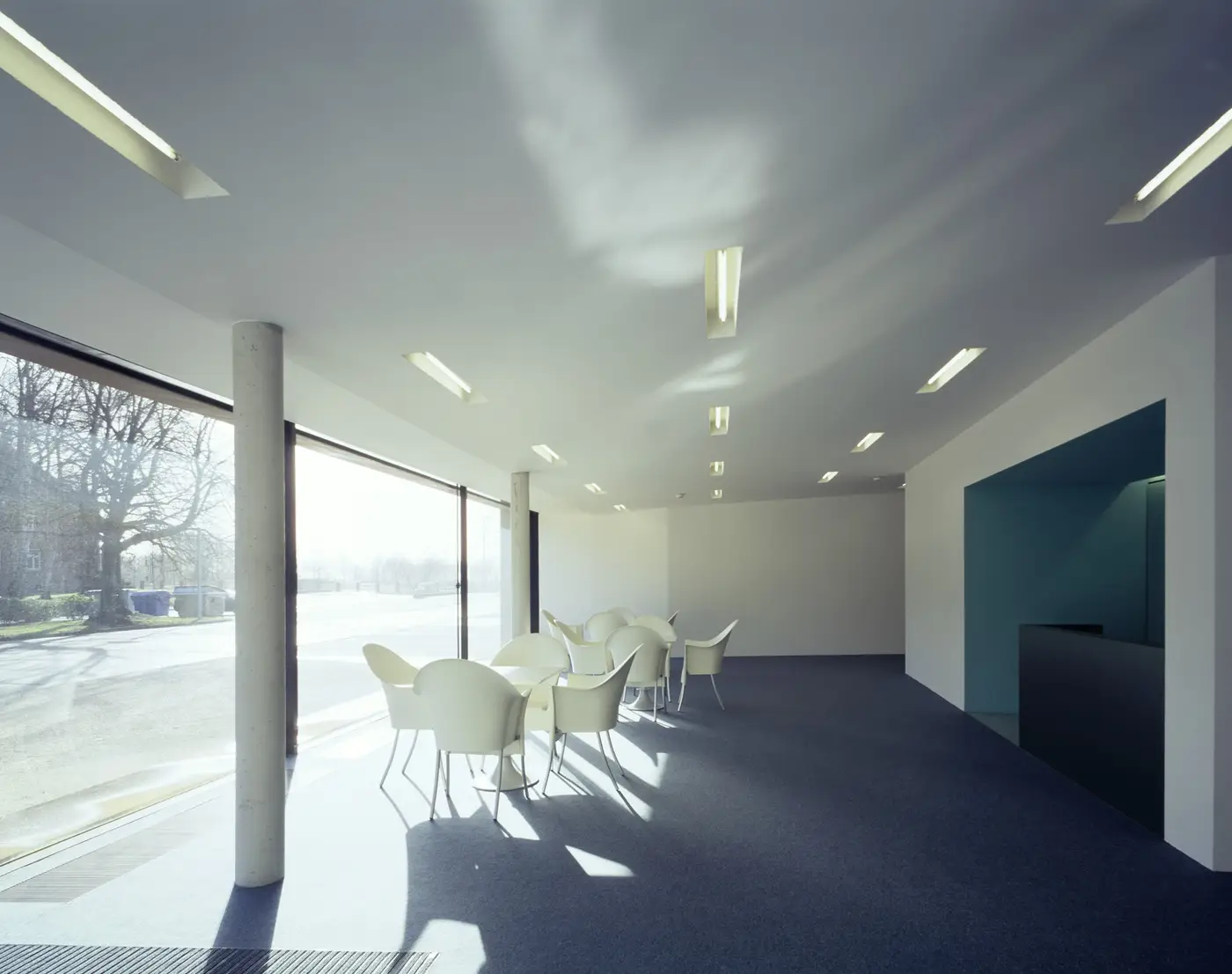 Aus Gründen der kurzfristigen Verfügbarkeit und wegen der positiven architektonischen und finanziellen Erfahrungen aus den anderen Altbauten wurde jedoch auch hier ein Umbau für ein zeitlich begrenztes “Provisorium" mit zwei ergänzenden Eingangsbereichen für die beiden Nutzungsbereiche erstellt.