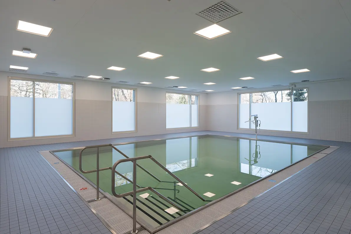 Freitreppen und drei Aufzüge erschließen die Geschosse. Das Haus verfügt über nutzungsspezifische Einrichtungen wie ein Therapieschwimmbad mit Hubboden, Pflegebäder, Therapieräume, einen Snoezelenraum, sowie einen barrierefreien Schulgarten mit Hochbeeten. Zentraler Ort ist der Mehrzweckraum mit Bühnenpodest und angeschlossener Mensaküche.