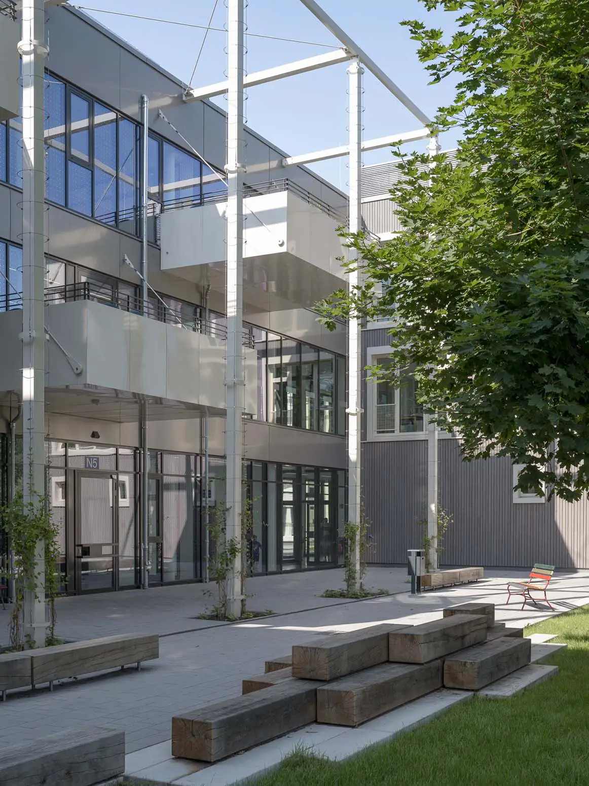 Der Entwurf für den Neubau der Panke-Schule möchte die vorhandenen Qualitäten des Standortes am Rande des Schlossparks Schönhausen weitgehend erhalten und einen Ort mit intensivem Naturbezug schaffen. Vier Schulhäuser, wechselseitig an einer verbindenden Achse - der Schulstraße - aufgereiht, bieten kleine Einheiten, die den Grünraum einbinden, maßstäblich mit der Umgebung korrespondieren und jeweils Zugang zu eigenen Flächen des Parkgrundstückes erhalten. Der Schulstraße vorgelagerte berankte Pergolen mit Balkonen erlauben Schülern und Lehrern auf allen Geschossen, auf kurzem Wege in die Natur und den Garten zu treten. Im östlichen Grundstücksbereich, orientiert zum Grundstück der Sporthalle, ist ein großzügiger Vorfahrtsbereich gelegen. Große, offene Höfe bieten Platz auch für Großbäume.