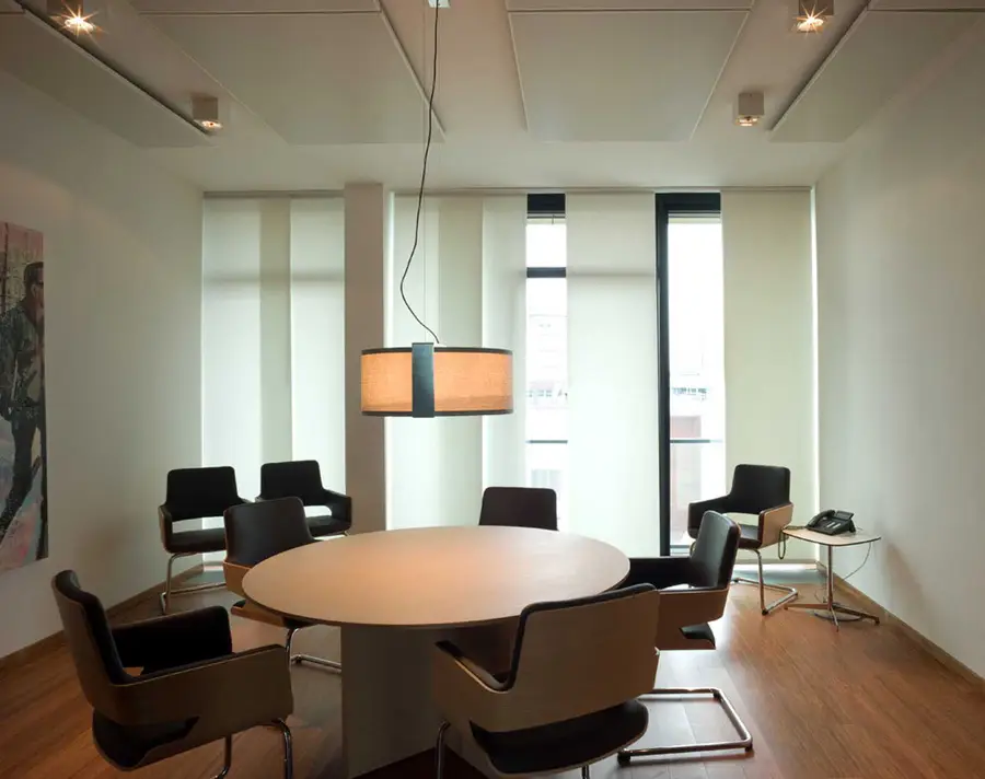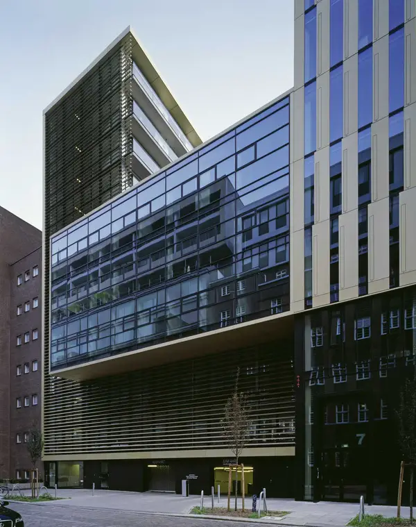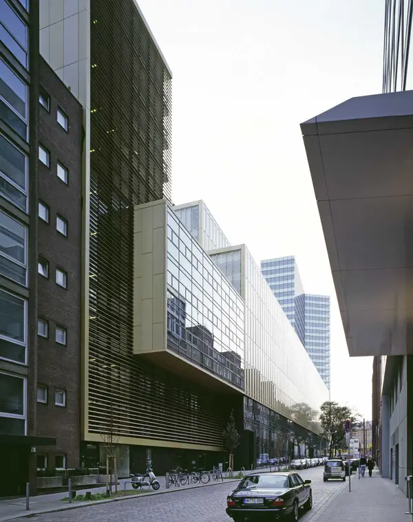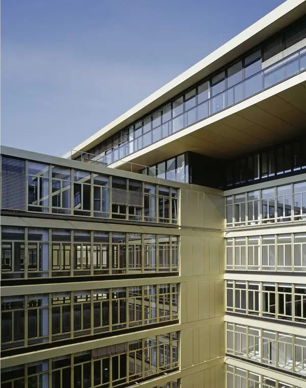 Die Straßen begleitende Fassade wird in geschosshohe vertikale Streifen aus Glas und geschlossenen Paneelen mit integrierten Flügeln gegliedert. Durch minimale Variationen entsteht eine überraschende Dynamik und Irritation in der Wahrnehmung dieser absolut planen und eleganten Fassade.