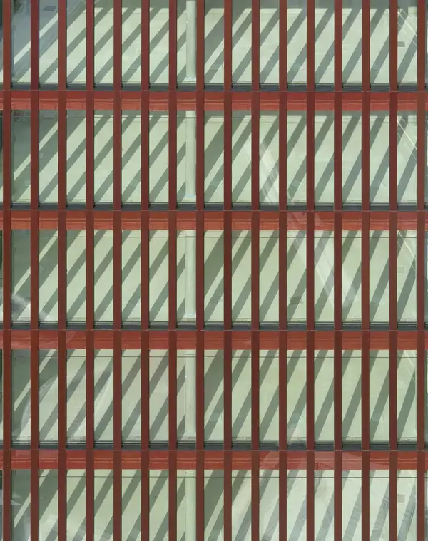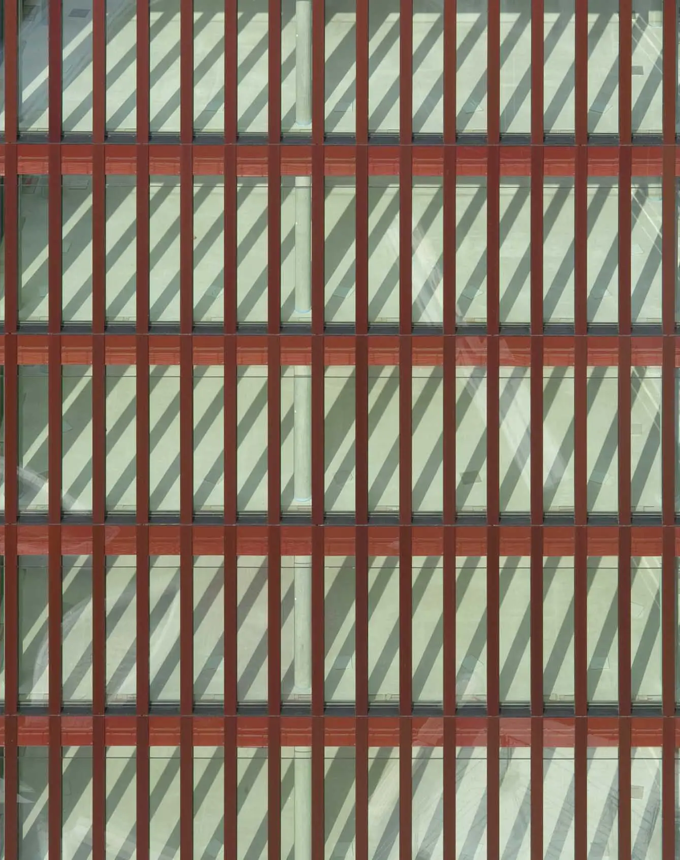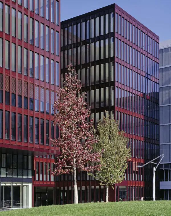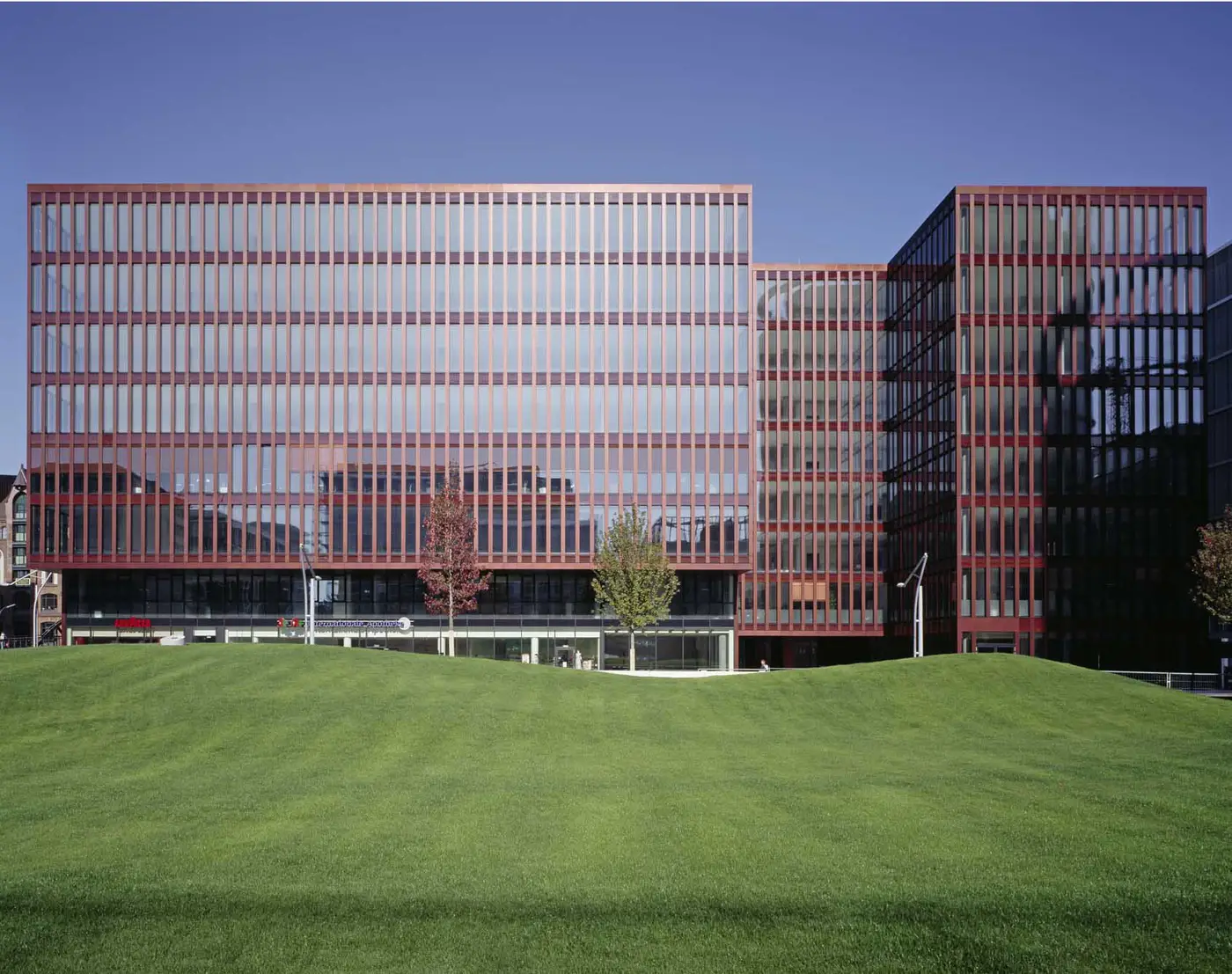 Der gestalterisch und konstruktiv gleichermaßen einfache wie komplexe Baukörper fügt sich durch eine elegante, dunkelrote Aluminiumfassade selbstbewusst in die historische und neue Umgebung ein.