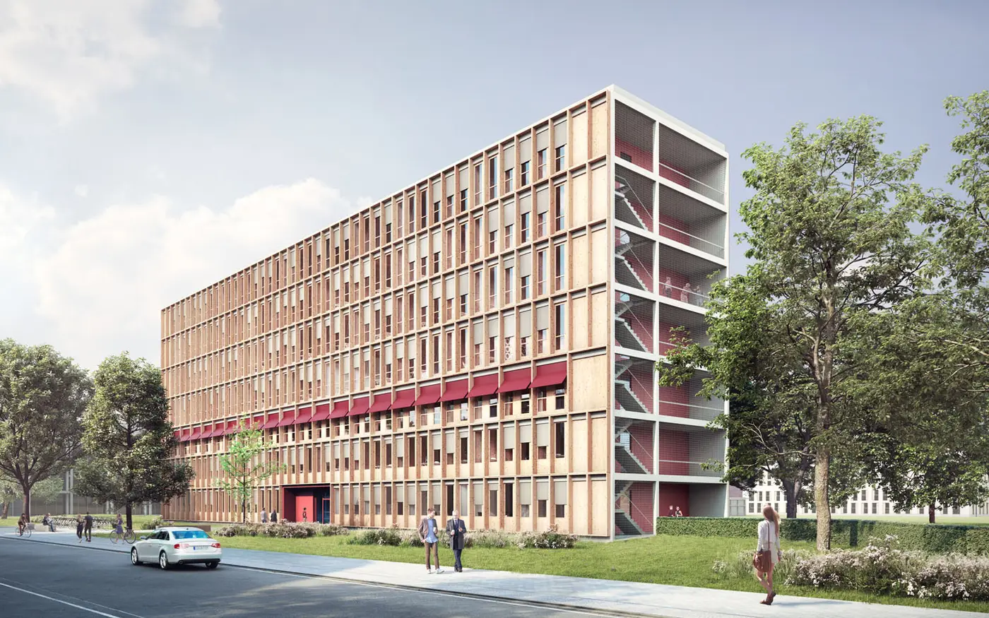 Das 7-geschossige Gebäude ist unter der Zielsetzung einer optimierten CO2-Bilanz in modularer Holzhybridbauweise mit aussteifendem Stahlbetonkern geplant.