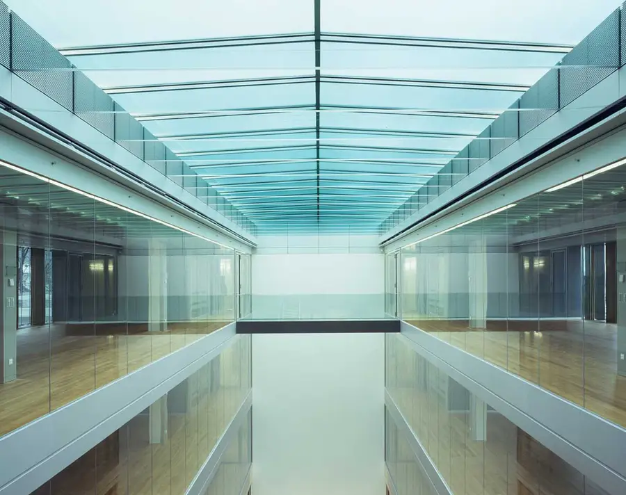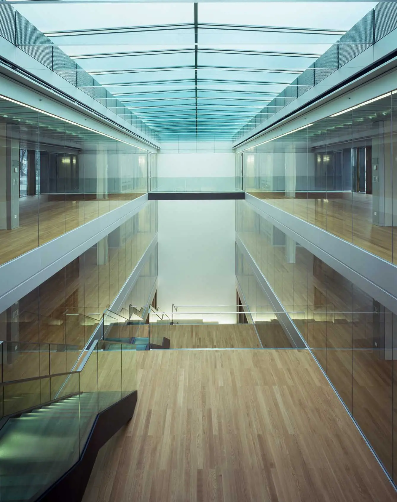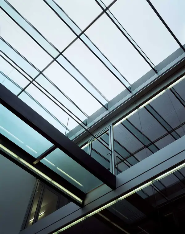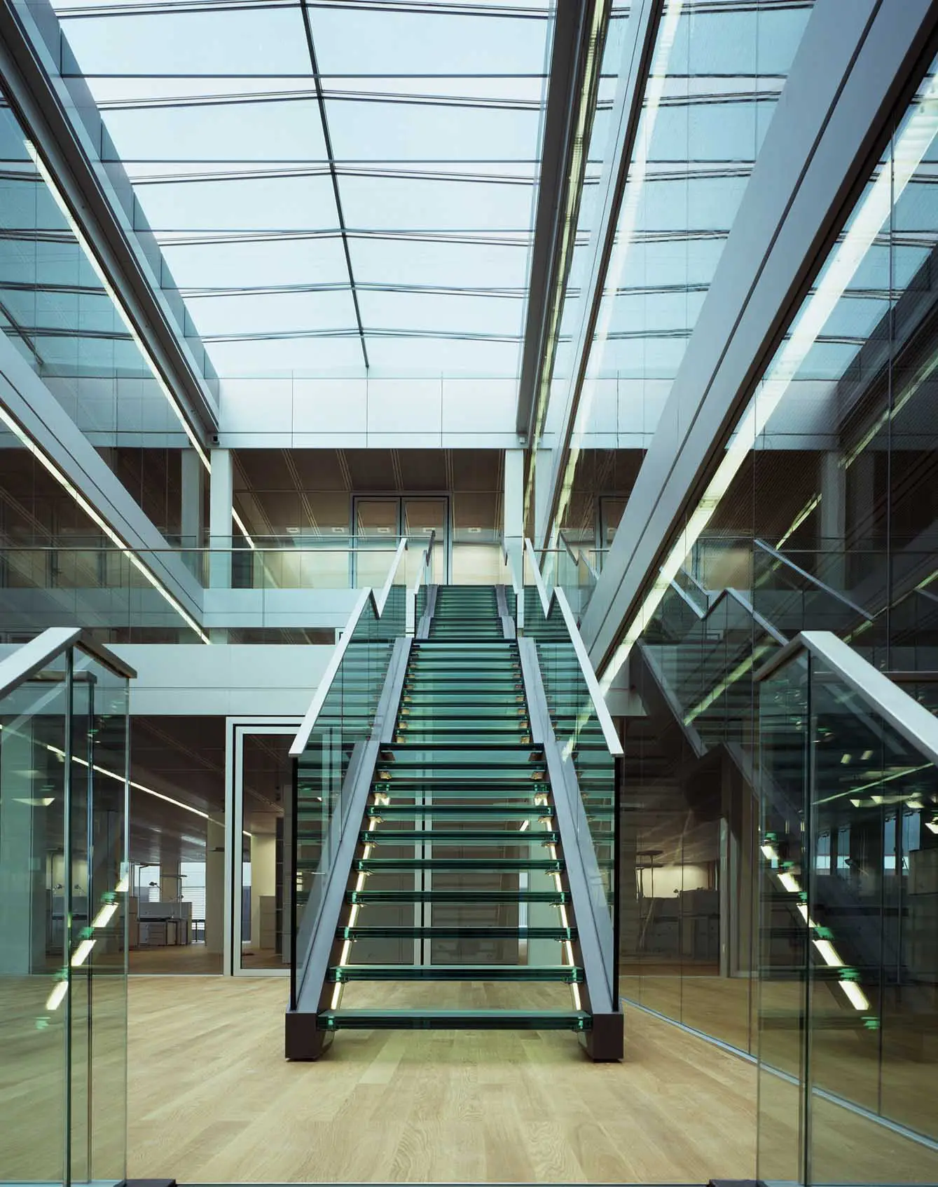 Besonderes Merkmal der überwiegend in Großräumen angeordneten Büros sind die Licht durchfluteten Hallen, die eine großzügige und kommunikative Atmosphäre erzeugen.