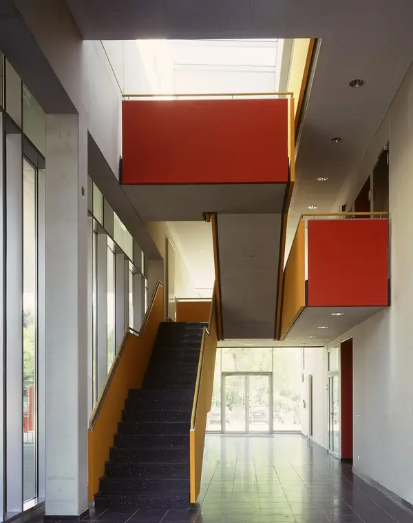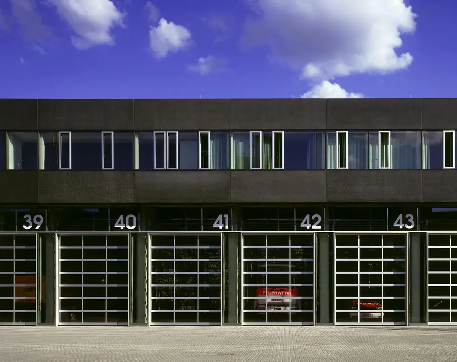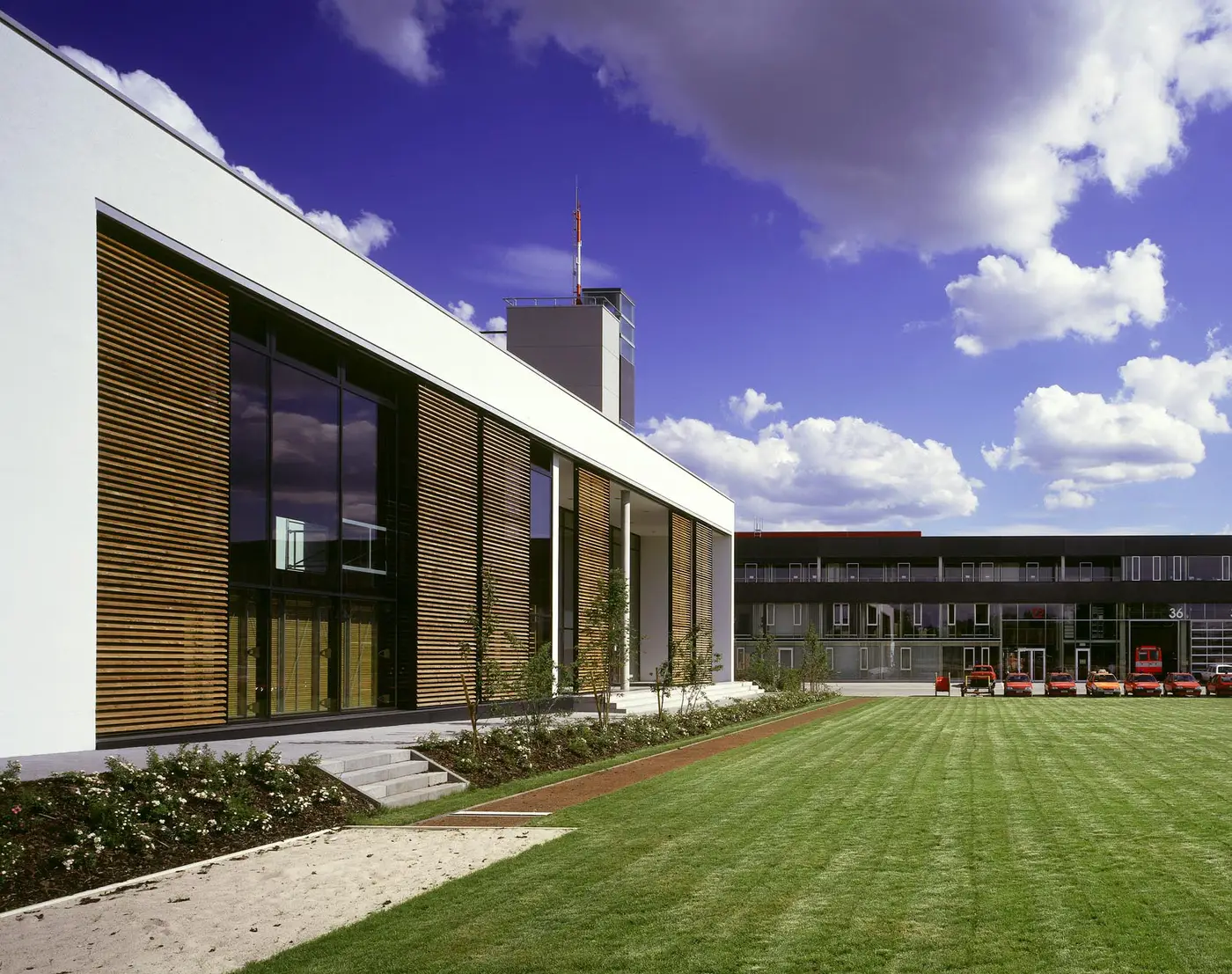 Das zweigeschossige Hauptgebäude am Marbachweg gibt der Feuerwehr mit seinen klaren und eindeutigen Raumkanten eine noble Präsenz im Stadtraum, ohne seine Umgebung zu dominieren. Es umfasst einen großzügigen Innenhof, von dem alle Bereiche erschlossen werden.
