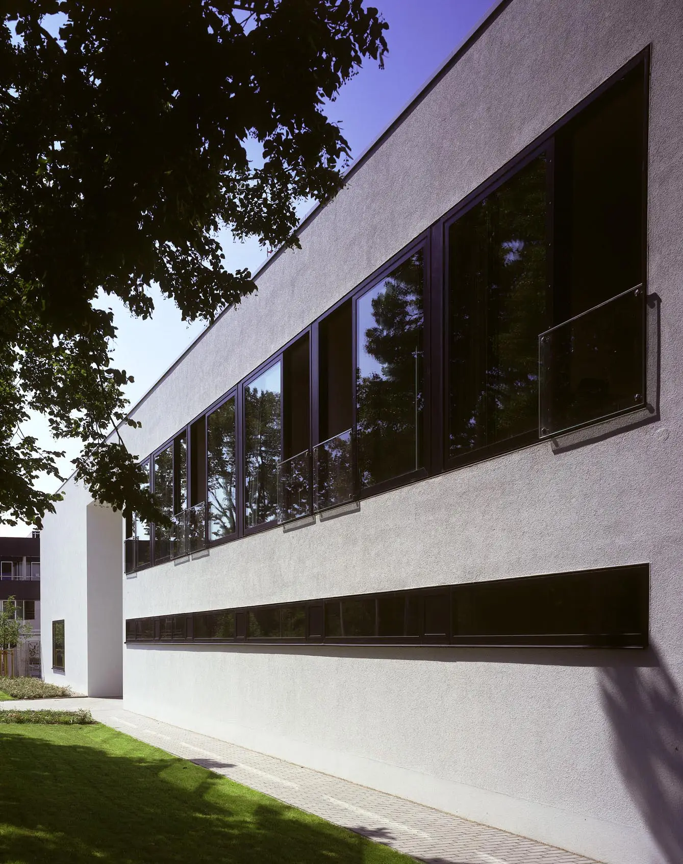 Restaurant, Sporthalle und Gästeappartements sind in einem separaten Baukörper angeordnet, der sich nördlich anschließt und etwas zurückgesetzt ist, um seine Eigenständigkeit zu betonen.