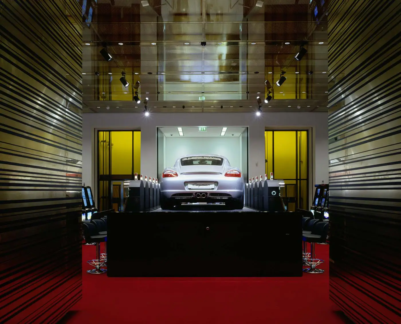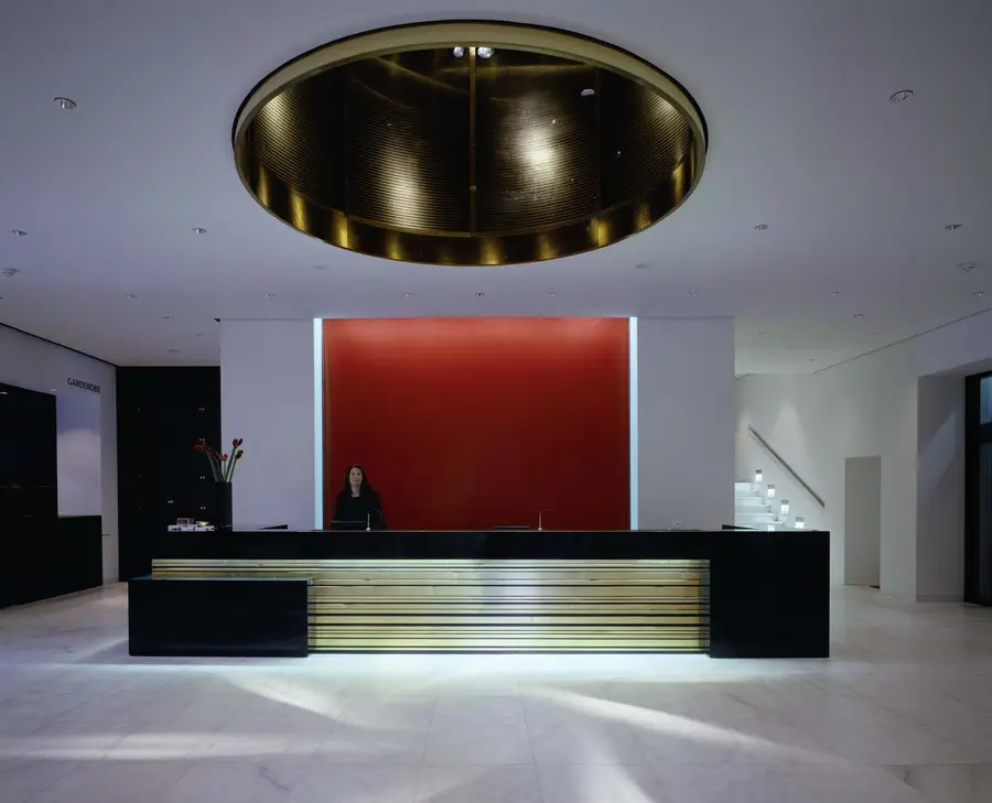 Das historische Raumgefüge mit seiner Axialität und den beeindruckenden Raumfolgen im Erdgeschoss und die zentrale Treppe wurden wiederhergestellt. In den Wand- und Deckenbekleidungen aus Messinglamellen, hochglanzlackierten oder lederfurnierten Tafeln wurde die aufwändige Gebäude- und Sicherheitstechnik und die Beleuchtung integriert.